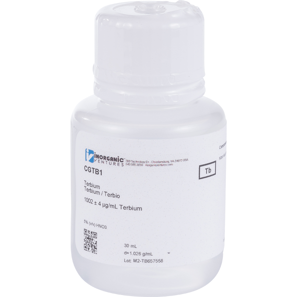 TerbiumLocation: Period 6 (lanthanoid) Storage & Handling: Keep tightly sealed when not in use. Store and use at 20 ± 4°C. Do not pipet from container. Do not return portions removed for pipetting to container. Chemical Compatibility: Soluble in HCl, H2SO4, and HNO3. Avoid HF, H3PO4, and neutral to basic media. Stable with most metals and inorganic anions forming an insoluble carbonate, oxide, oxalate, and fluoride. Avoid mixing with elements / solutions containing moderate amounts of fluoride. Stability: 2-100 ppb levels stable for months in 1% HNO3 / LDPE container. 1-10,000 ppm solutions chemically stable for years in 2-5% HNO3 / LDPE container. Tb Containing Samples (Preparation & Solution): Metal (soluble in acids); Oxide (dissolved by heating in H2O / HNO3); Ores (carbonate fusion in Pt0 followed by HCl dissolution); Organic Matrices (dry ash and dissolve in 1:1 H2O / HCl or HNO3). |