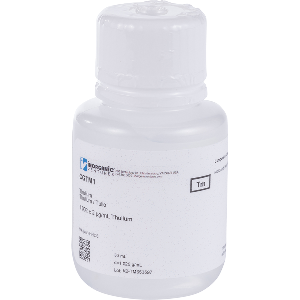 ThuliumLocation: Period 6 (lanthanoid) Storage & Handling: Keep tightly sealed when not in use. Store and use at 20 ± 4°C. Do not pipet from container. Do not return portions removed for pipetting to container. Chemical Compatibility: Soluble in HCl, H2SO4 and HNO3. Avoid HF, H3PO4, and neutral to basic media. Stable with most metals and inorganic anions forming an insoluble carbonate, oxide, oxalate, and fluoride. Avoid mixing with elements / solutions containing moderate amounts of fluoride. Stability: 2-100 ppb levels stable for months in 1% HNO3 / LDPE container. 1-10,000 ppm solutions chemically stable for years in 2-5% HNO3 / LDPE container. Tm Containing Samples (Preparation & Solution): Metal (soluble in acids); Oxide (dissolved by heating in H2O / HNO3); Ores (carbonate fusion in Pt0 followed by HCl dissolution); Organic Matrices (dry ash and dissolve in 1:1 H2O / HCl or HNO3). |