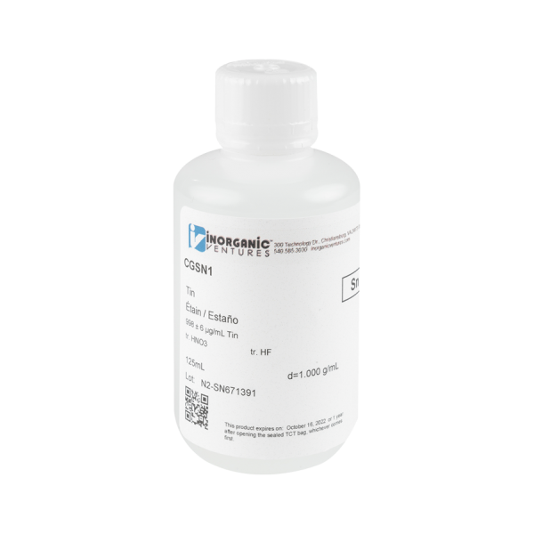 TinLocation: Group 14, Period 5 Storage & Handling: Keep tightly sealed when not in use. Store and use at 20 ± 4°C. Do not pipet from container. Do not return portions removed for pipetting to container. Chemical Compatibility: Soluble in HCl and dilute HF / HNO3. Avoid neutral to basic media. Unstable at ppm levels with metals that would pull F- away (i.e. - do not mix with Alkaline or Rare Earths or high levels of transition elements unless they are fluorinated). Stable with most inorganic anions, provided it is in the chemical form shown above. Stability: 2-100 ppb levels stable (alone or mixed with all other metals that are at comparable levels) as the Sn(OH)xFy2- for 1 year in 1% HNO3 / LDPE container. 1-10,000 ppm single element solutions as the Sn(OH)xFy2- are chemically stable for years in 2-5% HNO3 / trace HF in a LDPE container. Sn Containing Samples (Preparation & Solution): Metal (soluble in HF / HNO3 or HCl); Oxides - SnO (soluble in HCl), SnO2 - very resistant to all acids including HF (fusion with equal parts of Na2CO3 and S is soluble in water or dilute acids as the thiostannate); Alloys (treat first 0.1 g with 10 mL conc. H2SO4 to boiling until the alloy disintegrates and nearly all of the Sulphuric acid is expelled. Then add 100 mL O2 free water and 50 mL of conc HCl or transfer to a plastic container and add 1 mL HF, in either case, warming gently to bring about solution); Organic Matrices (volatility and precipitation of the insoluble stannic oxide are problems -- because these preparations are prone to error, we recommend you contact our technical staff at sales@esslab.com or tel:01702 555577 and we'll provide you with the necessary data for your specific sample type). |