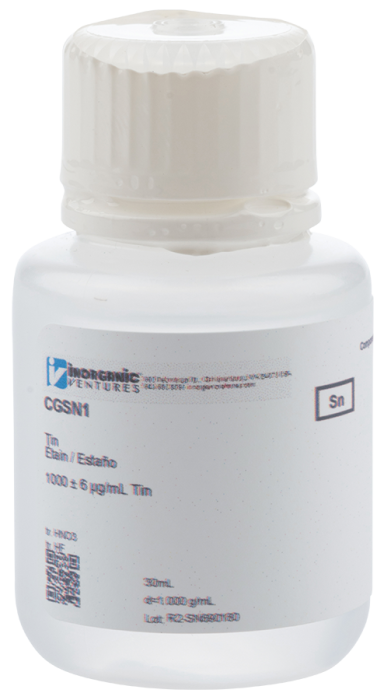 TinLocation: Group 14, Period 5 Storage & Handling: Keep tightly sealed when not in use. Store and use at 20 ± 4°C. Do not pipet from container. Do not return portions removed for pipetting to container. Chemical Compatibility: Soluble in HCl and dilute HF / HNO3. Avoid neutral to basic media. Unstable at ppm levels with metals that would pull F- away (i.e. - do not mix with Alkaline or Rare Earths or high levels of transition elements unless they are fluorinated). Stable with most inorganic anions, provided it is in the chemical form shown above. Stability: 2-100 ppb levels stable (alone or mixed with all other metals that are at comparable levels) as the Sn(OH)xFy2- for 1 year in 1% HNO3 / LDPE container. 1-10,000 ppm single element solutions as the Sn(OH)xFy2- are chemically stable for years in 2-5% HNO3 / trace HF in a LDPE container. Sn Containing Samples (Preparation & Solution): Metal (soluble in HF / HNO3 or HCl); Oxides - SnO (soluble in HCl), SnO2 - very resistant to all acids including HF (fusion with equal parts of Na2CO3 and S is soluble in water or dilute acids as the thiostannate); Alloys (treat first 0.1 g with 10 mL conc. H2SO4 to boiling until the alloy disintegrates and nearly all of the Sulphuric acid is expelled. Then add 100 mL O2 free water and 50 mL of conc HCl or transfer to a plastic container and add 1 mL HF, in either case, warming gently to bring about solution); Organic Matrices (volatility and precipitation of the insoluble stannic oxide are problems -- because these preparations are prone to error, we recommend you contact our technical staff at sales@esslab.com or tel:01702 555577 and we'll provide you with the necessary data for your specific sample type). |