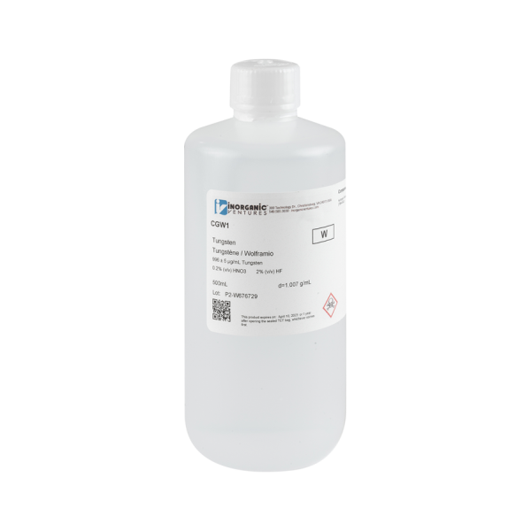 TungstenLocation: Group 6, Period 6 Storage & Handling: Keep tightly sealed when not in use. Store and use at 20 ± 4°C. Do not pipet from container. Do not return portions removed for pipetting to container. Chemical Compatibility: W is very readily hydrolyzed requiring 0.1 to 1% HF for stable acidic solutions. The [WOF5]-2 is soluble in % levels of HCl and HNO3, provided it is in the [WOF5]-2 form. Stable at ppm levels with some metals provided it is fluorinated. Do not mix with Alkaline or Rare Earths. W is best to be mixed only with other fluorinated metals (Ti, Zr, Hf, Nb, Ta, Mo, Si, Sn, Ge). Look for yellow WO3 precipitate if mixed with other transitions at higher levels indicating instability. The yellow WO3 will form over a period of weeks even in trace HF, therefore HF levels of W multi-element blends should be ~ 1%. Stability: 2-100 ppb levels stable (alone or mixed with all other metals that are at comparable levels) as the [WOF5]-2 for months in 1% HNO3 / LDPE container. 1-10,000 ppm single element solutions as the [WOF5]-2 chemically stable for years in 1% HF in a LDPE container. W Containing Samples (Preparation & Solution): Metal (soluble in HF / HNO3); Oxide (soluble in HF or NH4OH); Organic Matrices (dry ash at 450 0C in Pt0 and dissolve oxide with HF). |