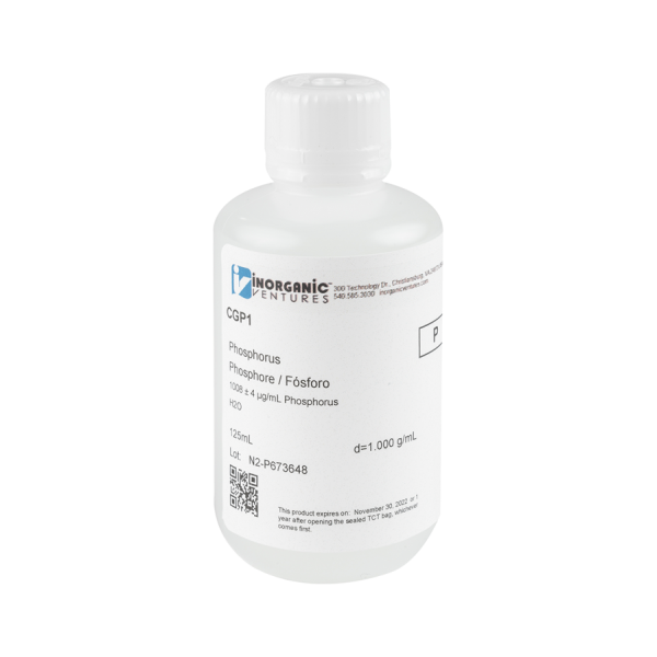 PhosphorusLocation:  Group 15, Period 3  Storage & Handling: Keep tightly sealed when not in use. Store and use at 20 ± 4°C. Do not pipet from container. Do not return portions removed for pipetting to container. Chemical Compatibility: Soluble in HCl, HNO3, H2SO4, and HF aqueous matrices water and NH4OH. Stable with all metals and inorganic anions at low to moderate ppm levels under acidic conditions; precipitates with several metals occur in neutral media at higher concentrations. Stability: 2-100 ppb levels - stability unknown - in 1% HNO3 / LDPE container. 1-10,000 ppm solutions chemically stable for years in 0-1% HNO3 / LDPE container. P Containing Samples (Preparation & Solution): Metal (never found free in nature); Oxides (water soluble); Ores (naturally occurring only as the phosphate, except for a few rare minerals found in meteorites - Na2CO3 fusion in Pt0); Organic Matrices (dry ash mixed with Na2CO3 in Pt0 at 450°C then increase heat to 1000°C to fuse; or, perform a H2SO4 / H2O2 acid digestion).  |