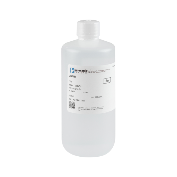 TinLocation:  Group 14, Period 5  Storage & Handling: Keep tightly sealed when not in use. Store and use at 20 ± 4°C. Do not pipet from container. Do not return portions removed for pipetting to container. Chemical Compatibility: Soluble in HCl and dilute HF / HNO3. Avoid neutral to basic media. Unstable at ppm levels with metals that would pull F- away (i.e. - do not mix with Alkaline or Rare Earths or high levels of transition elements unless they are fluorinated). Stable with most inorganic anions, provided it is in the chemical form shown above. Stability: 2-100 ppb levels stable (alone or mixed with all other metals that are at comparable levels) as the Sn(OH)xFy2- for 1 year in 1% HNO3 / LDPE container. 1-10,000 ppm single element solutions as the Sn(OH)xFy2- are chemically stable for years in 2-5% HNO3 / trace HF in a LDPE container. Sn Containing Samples (Preparation & Solution): Metal (soluble in HF / HNO3 or HCl); Oxides - SnO (soluble in HCl), SnO2 - very resistant to all acids including HF (fusion with equal parts of Na2CO3 and S is soluble in water or dilute acids as the thiostannate); Alloys (treat first 0.1 g with 10 mL conc. H2SO4 to boiling until the alloy disintegrates and nearly all of the Sulphuric acid is expelled. Then add 100 mL O2 free water and 50 mL of conc HCl or transfer to a plastic container and add 1 mL HF, in either case, warming gently to bring about solution); Organic Matrices (volatility and precipitation of the insoluble stannic oxide are problems -- because these preparations are prone to error, we recommend you contact our technical staff at sales@esslab.com or tel:01702 555577 and we'll provide you with the necessary data for your specific sample type).  |