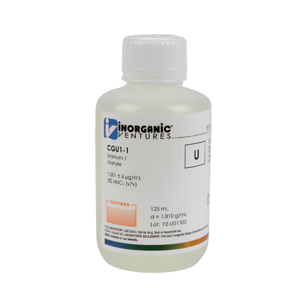 UraniumLocation:  Period 7 (actinoid)  Storage & Handling: Keep tightly sealed when not in use. Store and use at 20 ± 4°C. Do not pipet from container. Do not return portions removed for pipetting to container. Chemical Compatibility: Soluble in HCl and HNO3. Avoid H3PO4. H2SO4 and HF matrices should not be a problem depending upon [U]. Although the UO22+ ion is distinctly basic, any U+4 will ppt. in basic media. UO22+salts are generally soluble in water and UO22+ is stable with most metals and inorganic anions. The uranyl phosphate is insoluble in water. UF4 and UF6 are water soluble. Stability: 2-100 ppb levels stable for months in 1% HNO3 / LDPE container. 1-10,000 ppm solutions chemically stable for years in 2-5% HNO3 / LDPE container. U Containing Samples (Preparation & Solution): Metal (dissolves rapidly in HCl and HNO3); Oxide (soluble in HNO3); Ores (digest for 1-2 hours with 1 gram of ore to 30 mL 1:1 HNO3. Silica insolubles are removed by filtration after bringing the sample to fumes with conc. H2SO4).  |