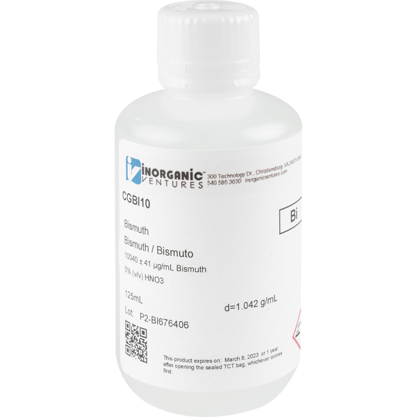BismuthLocation: Group 15, Period 6 Storage & Handling: Keep tightly sealed when not in use. Store and use at 20 ± 4°C. Do not pipet from container. Do not return portions removed for pipetting to container. Chemical Compatibility: Stable in HCl, HNO3, H2SO4, and HF. Avoid basic media forming insoluble hydroxide. Stable with most metals and inorganic anions in acidic media. Many salts that are insoluble in water are soluble in HCl, HNO3 and HF. The major problem with Bi3+ is its tendency to hydrolyze at higher concentrations or in dilute acid. Nitric acid solutions should be 5% to hold the Bi in solution in the 100 to 10000 µg/mL concentration range. Stability: 2-100 ppb levels stable for months in 1 % HNO3 / LDPE container. 1-10,000 ppm solutions chemically stable for years in 5 - 7% HNO3 / LDPE container. Bi Containing Samples (Preparation & Solution): Metal (soluble in HNO3); Oxides (soluble in HNO3); Alloys (dissolve in conc. 4:1 HCl / HNO3 - heating may be required.); Organic based (dry ash at 450°C and dissolve ash in HNO3 or acid digestion with conc. hot Sulphuric acid adding hydrogen peroxide carefully dropwise until clear). |