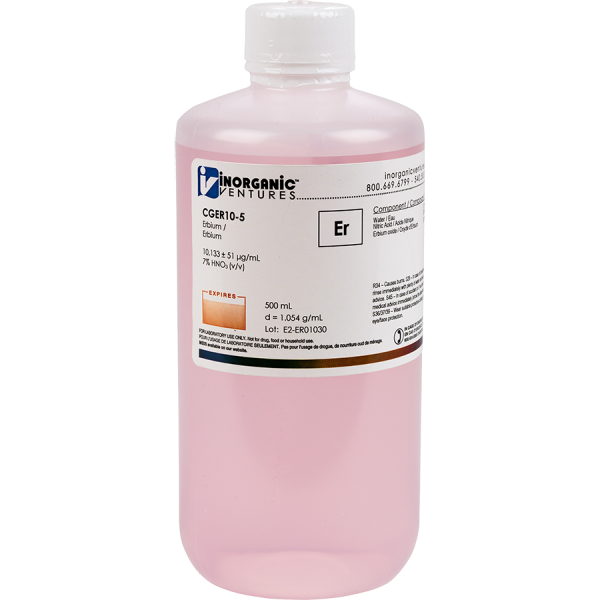 ErbiumLocation: Period 6 (lanthanoid) Storage & Handling: Keep tightly sealed when not in use. Store and use at 20 ± 4°C. Do not pipet from container. Do not return portions removed for pipetting to container. Chemical Compatibility: Soluble in HCl, H2SO4, and HNO3. Avoid HF, H3PO4, and neutral to basic media. Stable with most metals and inorganic anions forming an insoluble carbonate, oxide, oxalate, and fluoride. Avoid mixing with elements / solutions containing moderate amounts of fluoride. Stability: 2-100 ppb levels stable for months in 1% HNO3 / LDPE container. 1-10,000 ppm solutions chemically stable for years in 2-5% HNO3 / LDPE container. Er Containing Samples (Preparation & Solution): Metal (soluble in acids); Oxide (dissolved by heating in H2O/ HNO3); Ores (carbonate fusion in Pt0 followed by HCl dissolution); Organic Matrices (dry ash and dissolve in 1:1 H2O / HCl or HNO3). |