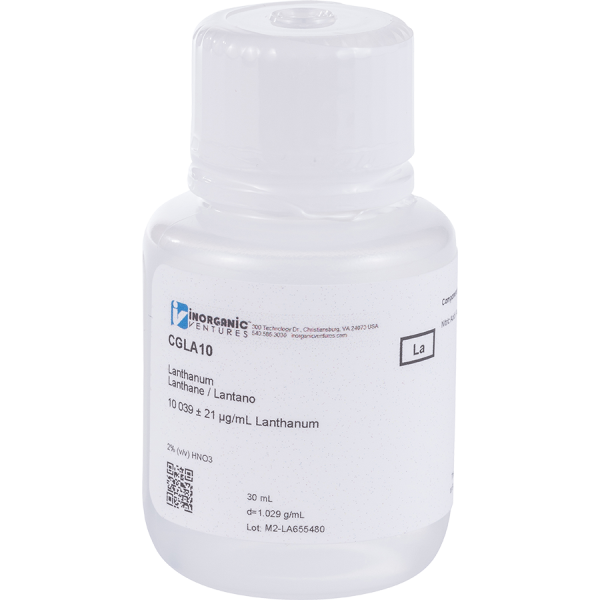 LanthanumLocation: Group 3, Period 6 (lanthanoid) Storage & Handling: Keep tightly sealed when not in use. Store and use at 20 ± 4°C. Do not pipet from container. Do not return portions removed for pipetting to container. Chemical Compatibility: Soluble in HCl and HNO3. Avoid HF, H3PO4, H2SO4 and neutral to basic media. Stable with most metals and inorganic anions forming an insoluble carbonate, oxide, oxalate, and fluoride and sparingly soluble sulfates (La - Eu exhibit low sulfate solubility). Avoid mixing with elements / solutions containing moderate amounts of fluoride. Stability: 2-100 ppb levels stable for months in 1% HNO3 / LDPE container. 1-10,000 ppm solutions chemically stable for years in 2-5 % HNO3 / LDPE container. La Containing Samples (Preparation & Solution): Metal (soluble in acids); Oxide (dissolved by heating in H2O / HNO3); Ores (carbonate fusion in Pt0 followed by HCl dissolution); Organic Matrices (dry ash and dissolve in 1:1 H2O / HCl or HNO3). |