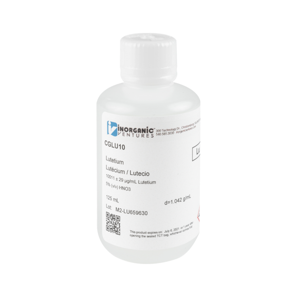 LutetiumLocation: Group 13, Period 5 Storage & Handling: Keep tightly sealed when not in use. Store and use at 20 ± 4°C. Do not pipet from container. Do not return portions removed for pipetting to container. Chemical Compatibility: Soluble in HCl, H2SO4, and HNO3. Avoid HF, H3PO4, and neutral to basic media. Stable with most metals and inorganic anions forming an insoluble carbonate, oxide, oxalate, and fluoride. Avoid mixing with elements / solutions containing moderate amounts of fluoride. Stability: 2-100 ppb levels stable for months in 1% HNO3 / LDPE container. 1-10,000 ppm solutions chemically stable for years in 2-5% HNO3 / LDPE container. Lu Containing Samples (Preparation & Solution): Metal (soluble in acids); Oxide (dissolved by heating in H2O / HNO3); Ores (carbonate fusion in Pt0 followed by HCl dissolution); Organic Matrices (dry ash and dissolve in 1:1 H2O / HCl or HNO3). |