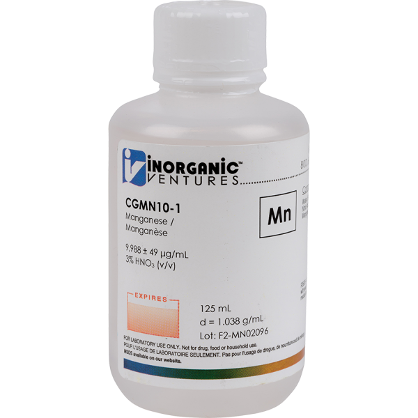ManganeseLocation:  Group 7, Period 4  Storage & Handling: Keep tightly sealed when not in use. Store and use at 20 ± 4°C. Do not pipet from container. Do not return portions removed for pipetting to container. Chemical Compatibility: Stable in HCl, HNO3, H2SO4, HF, and H3PO4. Avoid basic media. Stable with most metals and inorganic anions in acidic media. Stability: 2-100 ppb levels stable for months in 1% HNO3 / LDPE container. 1-10,000 ppm solutions chemically stable for years in 1-5 % HNO3 / LDPE container. Mn Containing Samples (Preparation & Solution): Metal (soluble in dilute acids); Oxides (soluble in dilute acids); Ores (dissolve with HCl. If silica is present, add HF and then fume off silica by adding H2SO4 and heat to SO3 fumes - dense white fumes). | |||||||||||||||||||||||||||||||||||