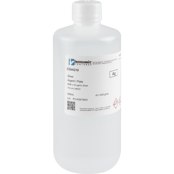 SilverLocation: Group 11, Period 5 Storage & Handling: Keep tightly sealed when not in use. Store and use at 20 ± 4°C. Do not pipet from container. Do not return portions removed for pipetting to container. Chemical Compatibility: Stable in HNO3 and HF. Avoid basic media. Ag forms more insoluble salts than any other metal. It also is subject to photochemical reduction to the metal in HCl media although 10 µg/mL solutions in 10% HCl [AgClx1-x] are commonly used in the analytical laboratory. The most common solubility problems exist with arsenate, arsenite, bromide, chloride, iodide, carbonate, chromate, cyanide, iodate, oxalate, oxide, sulfate, sulfide, tartrate, and thiocyanate in aqueous media. The addition of nitric acid renders many of these salts soluble. Stability: 2-100 ppb levels stable for 75+ days when mixed with equivalent levels of all other elements including the precious metals (where chloride is present) when in 1% HNO3 / LDPE container. 1-10,000 ppm solutions chemically stable for years in 1-5% HNO3 / LDPE container. Ag Containing Samples (Preparation & Solution): Metal (soluble in HNO3); Oxides (soluble in HNO3); Ores (digestion with conc. HNO3). |