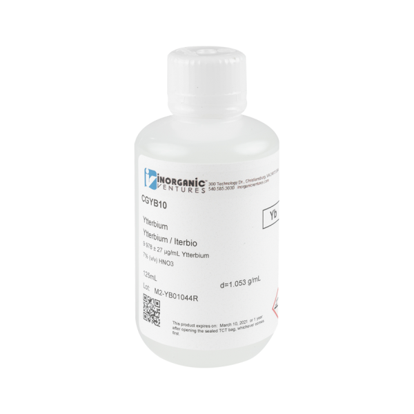 YtterbiumLocation: Period 6 (lanthanoid) Storage & Handling: Keep tightly sealed when not in use. Store and use at 20 ± 4°C. Do not pipet from container. Do not return portions removed for pipetting to container. Chemical Compatibility: Soluble in HCl, H2SO4, and HNO3. Avoid HF, H3PO4, and neutral to basic media. Stable with most metals and inorganic anions forming an insoluble carbonate, oxide, oxalate, and fluoride. Avoid mixing with elements / solutions containing moderate amounts of fluoride. Stability: 2-100 ppb levels stable for months in 1% HNO3 / LDPE container. 1-10,000 ppm solutions chemically stable for years in 2-5% HNO3 / LDPE container. Yb Containing Samples (Preparation & Solution): Metal (soluble in acids); Oxide (dissolved by heating in H2O / HNO3); Ores (carbonate fusion in Pt0 followed by HCl dissolution); Organic Matrices (dry ash and dissolve in 1:1 H2O / HCl or HNO3). |