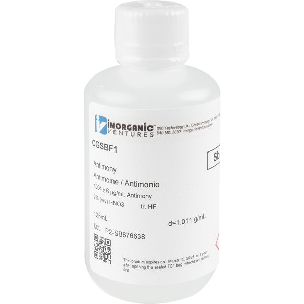AntimonyLocation:  Group 15, Period 5  Storage & Handling: Keep tightly sealed when not in use. Store and use at 20 ± 4°C. Do not pipet from container. Do not return portions removed for pipetting to container. Chemical Compatibility: Stable in conc. HCl, dilute or conc. HF. Stable in dilute HNO3 as the fluoride or tartrate complex. Avoid basic media. Stable with most metals and inorganic anions in acidic media as the tartrate provided the acidity is not too high or the acid is oxidizing causing loss of the stabilizing tartrate ion. The fluoride complex of antimony is stable in strong acid but you should only mix with other metals that are fluorinated. Stability: 2-100 ppb levels stable for months in 1% HNO3 / LDPE container. 1-10,000 ppm solutions chemically stable for years in 1-2% HNO3 / LDPE container. Sb Containing Samples (Preparation & Solution): Metal and alloys (soluble in H2O / HF / HNO3 mixture); Oxides (soluble in HCl and tartaric acid or H2O / HF / HNO3 mixtures); Ores (fusion with Na2CO3 in Pt0 followed by dissolving the fuseate in a H2O / HF / HNO3 mixture); Organic based (Sulphuric acid / hydrogen peroxide digestion). | |||||||||||||||||||||||||||||||||||