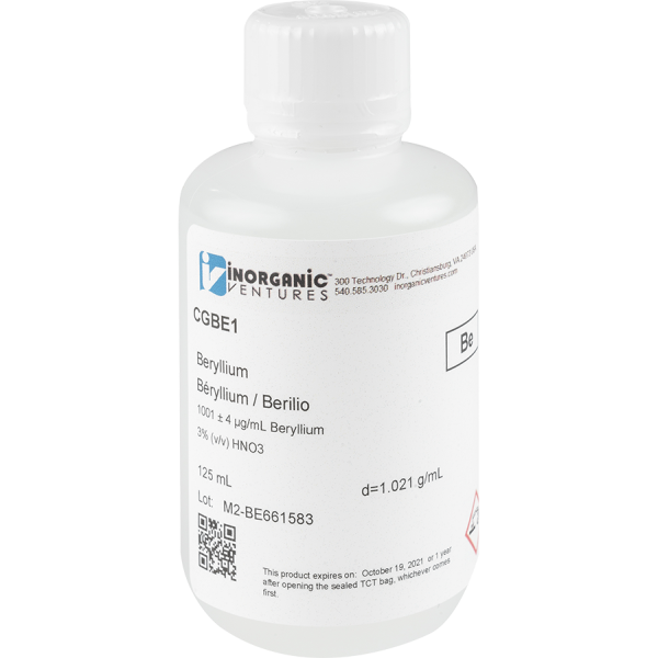 BerylliumLocation:  Group 2, Period 2  Storage & Handling: Keep tightly sealed when not in use. Store and use at 20 ± 4°C. Do not pipet from container. Do not return portions removed for pipetting to container. Chemical Compatibility: Soluble in HCl, HNO3, H2SO4 and HF aqueous matrices. Stable with all metals and inorganic anions. Stability: 2-100 ppb levels stable for months in 1 % HNO3 / LDPE container. 1-10,000 ppm solutions chemically stable for years in 5-10 % HNO3 / LDPE container. Be Containing Samples (Preparation & Solution): Metal (is best dissolved in diluted H2SO4); BeO (boiling nitric, hydrochloric, or Sulphuric acids or KHSO4 fusion); Ores (H2SO4/HF digestion or carbonate fusion in Pt0); Organic Matrices (Sulphuric / peroxide digestion or nitric / Sulphuric / perchloric acid decomposition, or dry ash and dissolution according to the BeO procedure above). | |||||||||||||||||||||||||||||||||||
