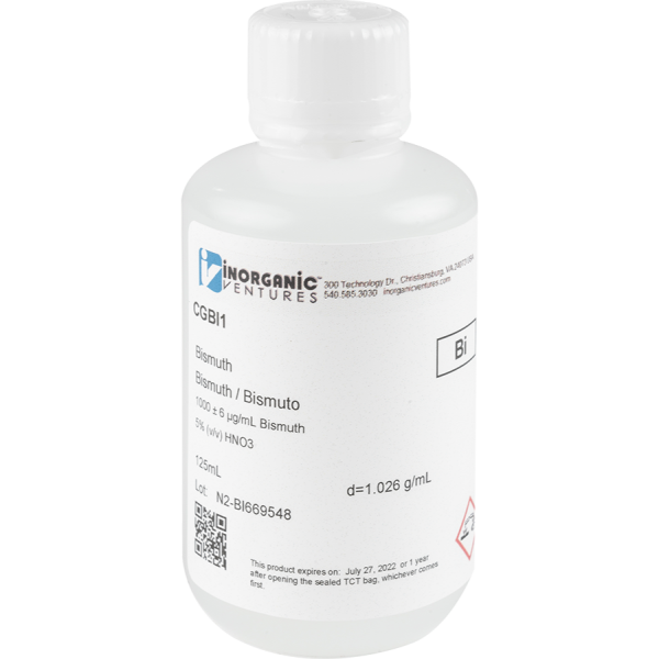 BismuthLocation:  Group 15, Period 6  Intended Use: For the calibration of analytical instruments and validation of analytical methods as appropriate.Storage & Handling: Keep tightly sealed when not in use. Store and use at 20 ± 4°C. Do not pipet from container. Do not return portions removed for pipetting to container. Chemical Compatibility: Stable in HCl, HNO3, H2SO4, and HF. Avoid basic media forming insoluble hydroxide. Stable with most metals and inorganic anions in acidic media. Many salts that are insoluble in water are soluble in HCl, HNO3 and HF. The major problem with Bi3+ is its tendency to hydrolyze at higher concentrations or in dilute acid. Nitric acid solutions should be 5% to hold the Bi in solution in the 100 to 10000 µg/mL concentration range. Stability: 2-100 ppb levels stable for months in 1 % HNO3 / LDPE container. 1-10,000 ppm solutions chemically stable for years in 5 - 7% HNO3 / LDPE container. Bi Containing Samples (Preparation & Solution): Metal (soluble in HNO3); Oxides (soluble in HNO3); Alloys (dissolve in conc. 4:1 HCl / HNO3 - heating may be required.); Organic based (dry ash at 450°C and dissolve ash in HNO3 or acid digestion with conc. hot Sulphuric acid adding hydrogen peroxide carefully dropwise until clear). | |||||||||||||||||||||||||||||||||||