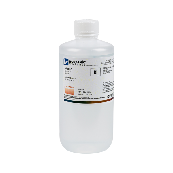 BismuthLocation:  Group 15, Period 6  Storage & Handling: Keep tightly sealed when not in use. Store and use at 20 ± 4°C. Do not pipet from container. Do not return portions removed for pipetting to container. Chemical Compatibility: Stable in HCl, HNO3, H2SO4, and HF. Avoid basic media forming insoluble hydroxide. Stable with most metals and inorganic anions in acidic media. Many salts that are insoluble in water are soluble in HCl, HNO3 and HF. The major problem with Bi3+ is its tendency to hydrolyze at higher concentrations or in dilute acid. Nitric acid solutions should be 5% to hold the Bi in solution in the 100 to 10000 µg/mL concentration range. Stability: 2-100 ppb levels stable for months in 1 % HNO3 / LDPE container. 1-10,000 ppm solutions chemically stable for years in 5 - 7% HNO3 / LDPE container. Bi Containing Samples (Preparation & Solution): Metal (soluble in HNO3); Oxides (soluble in HNO3); Alloys (dissolve in conc. 4:1 HCl / HNO3 - heating may be required.); Organic based (dry ash at 450°C and dissolve ash in HNO3 or acid digestion with conc. hot Sulphuric acid adding hydrogen peroxide carefully dropwise until clear). | |||||||||||||||||||||||||||||||||||