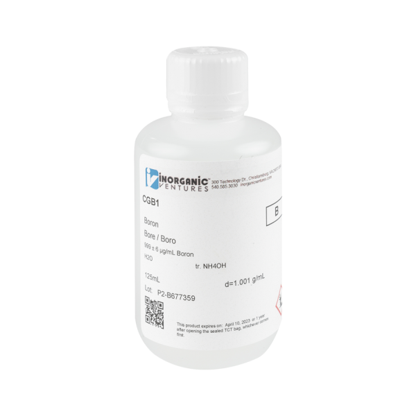 BoronLocation:  Group 13, Period 2  Intended Use: For the calibration of analytical instruments and validation of analytical methods as appropriate.Storage & Handling: Keep tightly sealed when not in use. Store and use at 20 ± 4°C. Do not pipet from container. Do not return portions removed for pipetting to container. Chemical Compatibility: Moderately soluble in HCl, HNO3, H2SO4 and HF aqueous matrices and very soluble in NH4OH. Stable with all metals and inorganic anions at low to moderate ppm levels. Stability: 2-100 ppb levels stable for months in 1% HNO3 / LDPE container. 1-1,000 ppm solutions chemically stable for years in 1% HNO3 / LDPE container. 1000-10,000 ppm stable for years in dilute NH4OH / LDPE container. B Containing Samples (Preparation & Solution): Metal (crystalline form is scarcely attacked by acids or alkaline solutions; amorphous form is soluble in conc. HNO3 or H2SO4); B(OH)3 (water soluble); Ores (avoid acid digestions and use caustic fusions in Pt0); Organic Matrices (dry ash mixed with Na2CO3 in Pt0 at 450°C then increase heat to 1000°C to fuse; or perform a Na2O2 fusion in a Ni0 crucible / Parr bomb). | |||||||||||||||||||||||||||||||||||