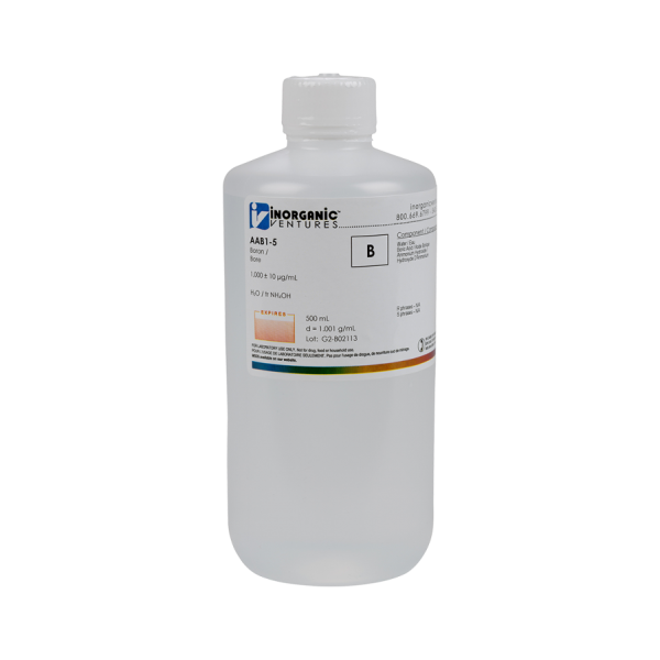 BoronLocation:  Group 13, Period 2  Storage & Handling: Keep tightly sealed when not in use. Store and use at 20 ± 4°C. Do not pipet from container. Do not return portions removed for pipetting to container. Chemical Compatibility: Moderately soluble in HCl, HNO3, H2SO4 and HF aqueous matrices and very soluble in NH4OH. Stable with all metals and inorganic anions at low to moderate ppm levels. Stability: 2-100 ppb levels stable for months in 1% HNO3 / LDPE container. 1-1,000 ppm solutions chemically stable for years in 1% HNO3 / LDPE container. 1000-10,000 ppm stable for years in dilute NH4OH / LDPE container. B Containing Samples (Preparation & Solution): Metal (crystalline form is scarcely attacked by acids or alkaline solutions; amorphous form is soluble in conc. HNO3 or H2SO4); B(OH)3 (water soluble); Ores (avoid acid digestions and use caustic fusions in Pt0); Organic Matrices (dry ash mixed with Na2CO3 in Pt0 at 450°C then increase heat to 1000°C to fuse; or perform a Na2O2 fusion in a Ni0 crucible / Parr bomb). | |||||||||||||||||||||||||||||||||||