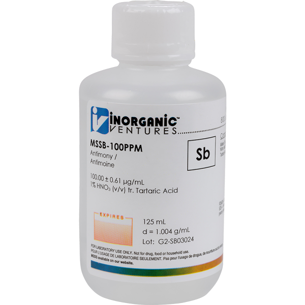 AntimonyLocation: Group 15, Period 5 Intended Use: For the calibration of analytical instruments and validation of analytical methods as appropriate.Storage & Handling: Keep tightly sealed when not in use. Store and use at 20 ± 4°C. Do not pipet from container. Do not return portions removed for pipetting to container. Chemical Compatibility: Stable in conc. HCl, dilute or conc. HF. Stable in dilute HNO3 as the fluoride or tartrate complex. Avoid basic media. Stable with most metals and inorganic anions in acidic media as the tartrate provided the acidity is not too high or the acid is oxidizing causing loss of the stabilizing tartrate ion. The fluoride complex of antimony is stable in strong acid but you should only mix with other metals that are fluorinated. Stability: 2-100 ppb levels stable for months in 1% HNO3 / LDPE container. 1-10,000 ppm solutions chemically stable for years in 1-2% HNO3 / LDPE container. Sb Containing Samples (Preparation & Solution): Metal and alloys (soluble in H2O / HF / HNO3 mixture); Oxides (soluble in HCl and tartaric acid or H2O / HF / HNO3 mixtures); Ores (fusion with Na2CO3 in Pt0 followed by dissolving the fuseate in a H2O / HF / HNO3 mixture); Organic based (Sulphuric acid / hydrogen peroxide digestion). |