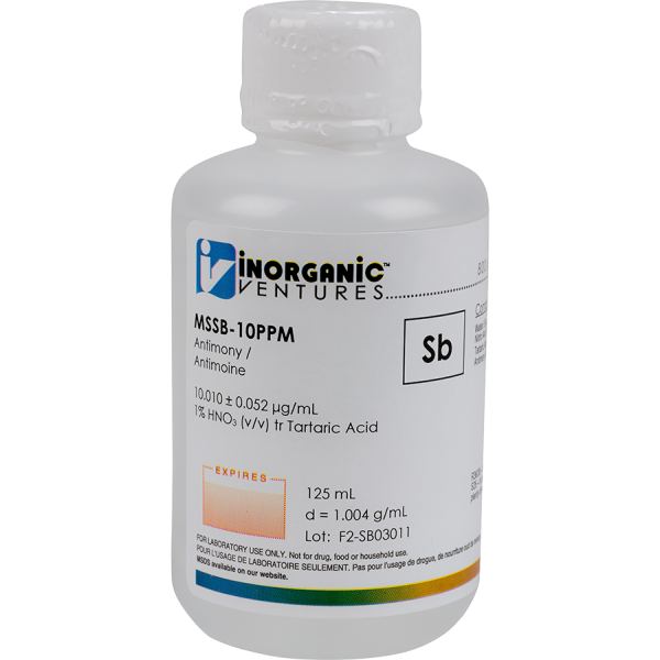 AntimonyLocation: Group 15, Period 5 Intended Use: For the calibration of analytical instruments and validation of analytical methods as appropriate.Storage & Handling: Keep tightly sealed when not in use. Store and use at 20 ± 4°C. Do not pipet from container. Do not return portions removed for pipetting to container. Chemical Compatibility: Stable in conc. HCl, dilute or conc. HF. Stable in dilute HNO3 as the fluoride or tartrate complex. Avoid basic media. Stable with most metals and inorganic anions in acidic media as the tartrate provided the acidity is not too high or the acid is oxidizing causing loss of the stabilizing tartrate ion. The fluoride complex of antimony is stable in strong acid but you should only mix with other metals that are fluorinated. Stability: 2-100 ppb levels stable for months in 1% HNO3 / LDPE container. 1-10,000 ppm solutions chemically stable for years in 1-2% HNO3 / LDPE container. Sb Containing Samples (Preparation & Solution): Metal and alloys (soluble in H2O / HF / HNO3 mixture); Oxides (soluble in HCl and tartaric acid or H2O / HF / HNO3 mixtures); Ores (fusion with Na2CO3 in Pt0 followed by dissolving the fuseate in a H2O / HF / HNO3 mixture); Organic based (Sulphuric acid / hydrogen peroxide digestion). |