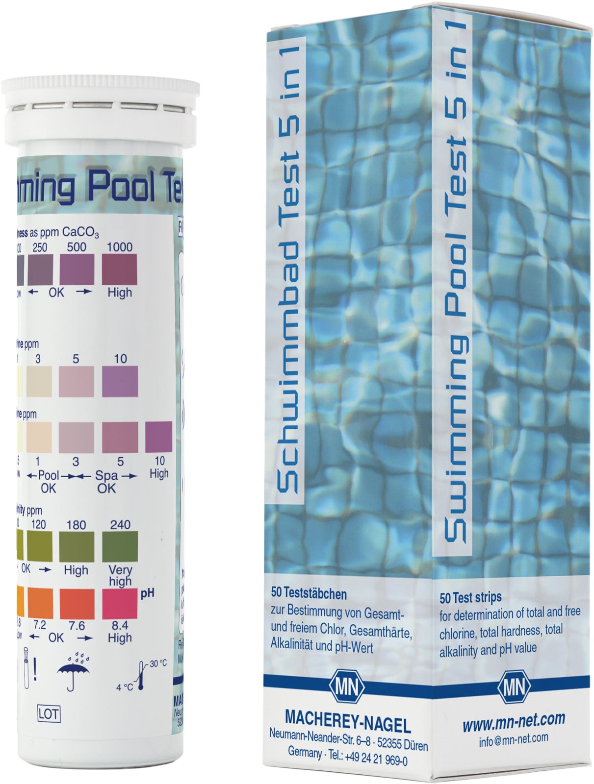 Swimming pool test 5 in 1 allows the quick and easy determination of the water quality in swimming pools. It measures free chlorine, total chlorine, alkalinity, total hardness and pH.