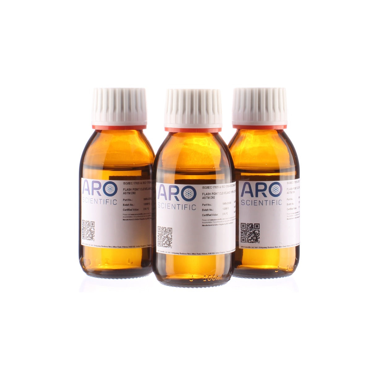 ISO/IEC 17025 / ISO 17034 certified Cleveland Open Cup (COC) Flash Point Standards are tested and certified in accordance with ASTM D92 'Standard Test Method for Flash and Fire Points by Cleveland Open Cup Tester.' These UKAS certified flash point secondary working standards are specifically designed to be used for regular instrument performance checks. Packed uniquely in 3 x 80 mL 'single shot' bottles assuring the highest level of sample integrity. An economical, time saving addition to any laboratory concerned with the generation of valid analytical test data. Typically used in, but not limited to, the analysis of petroleum products with flash points above 79 °C (175 °F) and below 400 °C (752 °F)