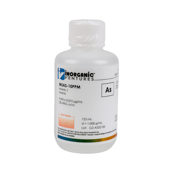 ArsenicLocation: Group 15, Period 4 Intended Use: For the calibration of analytical instruments and validation of analytical methods as appropriate.Storage & Handling: Keep tightly sealed when not in use. Store and use at 20 ± 4°C. Do not pipet from container. Do not return portions removed for pipetting to container. Chemical Compatibility: Arsenic has no cationic chemistry. It is soluble in HCl, HNO3,H3PO4, H2SO4 and HF aqueous matrices water and NH4OH. It is stable with most inorganic anions (forms arsenate when boiled with chromate) but many cationic metals form the insoluble arsenates under pH neutral conditions. When fluorinated and/or under acidic conditions arsenate formation is typically not a problem at moderate to low concentrations. Stability: 2-100 ppb levels - stable for months alone or mixed with other elements at equivalent levels - in 1% HNO3 / LDPE container. 1-10,000 ppm solutions chemically stable for years in 1-5% HNO3 / LDPE container. As Containing Samples (Preparation & Solution): Metal (soluble in 1:1 H2O / HNO3); Oxides (the oxide exists in crystalline and amorphous forms where the amorphoric form is more water soluble. The oxides typically dissolve in dilute acidic solutions when boiled); Minerals (one gram of powered sample is fused in a Ni0 crucible with 10 grams of a 1:1 mix of K2CO3 and KNO3 and the melt extracted with hot water); Organic Matrices (0.2 to 0.5 grams of the sample are fused with 15 grams of a 1:1 Na2CO3 / Na2O2 mix in a Ni0 crucible. The fuseate is extracted with water and acidified with HNO3). |