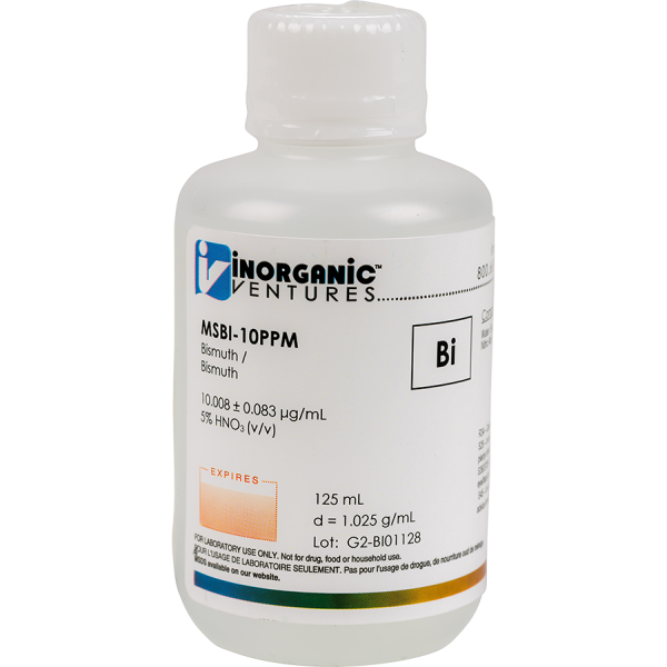 BismuthLocation: Group 15, Period 6 Intended Use: For the calibration of analytical instruments and validation of analytical methods as appropriate.Storage & Handling: Keep tightly sealed when not in use. Store and use at 20 ± 4°C. Do not pipet from container. Do not return portions removed for pipetting to container. Chemical Compatibility: Stable in HCl, HNO3, H2SO4, and HF. Avoid basic media forming insoluble hydroxide. Stable with most metals and inorganic anions in acidic media. Many salts that are insoluble in water are soluble in HCl, HNO3 and HF. The major problem with Bi3+ is its tendency to hydrolyze at higher concentrations or in dilute acid. Nitric acid solutions should be 5% to hold the Bi in solution in the 100 to 10000 µg/mL concentration range. Stability: 2-100 ppb levels stable for months in 1 % HNO3 / LDPE container. 1-10,000 ppm solutions chemically stable for years in 5 - 7% HNO3 / LDPE container. Bi Containing Samples (Preparation & Solution): Metal (soluble in HNO3); Oxides (soluble in HNO3); Alloys (dissolve in conc. 4:1 HCl / HNO3 - heating may be required.); Organic based (dry ash at 450°C and dissolve ash in HNO3 or acid digestion with conc. hot Sulphuric acid adding hydrogen peroxide carefully dropwise until clear). |