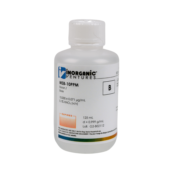 BoronLocation: Group 13, Period 2 Intended Use: For the calibration of analytical instruments and validation of analytical methods as appropriate.Storage & Handling: Keep tightly sealed when not in use. Store and use at 20 ± 4°C. Do not pipet from container. Do not return portions removed for pipetting to container. Chemical Compatibility: Moderately soluble in HCl, HNO3, H2SO4 and HF aqueous matrices and very soluble in NH4OH. Stable with all metals and inorganic anions at low to moderate ppm levels. Stability: 2-100 ppb levels stable for months in 1% HNO3 / LDPE container. 1-1,000 ppm solutions chemically stable for years in 1% HNO3 / LDPE container. 1000-10,000 ppm stable for years in dilute NH4OH / LDPE container. B Containing Samples (Preparation & Solution): Metal (crystalline form is scarcely attacked by acids or alkaline solutions; amorphous form is soluble in conc. HNO3 or H2SO4); B(OH)3 (water soluble); Ores (avoid acid digestions and use caustic fusions in Pt0); Organic Matrices (dry ash mixed with Na2CO3 in Pt0 at 450°C then increase heat to 1000°C to fuse; or perform a Na2O2 fusion in a Ni0 crucible / Parr bomb). |