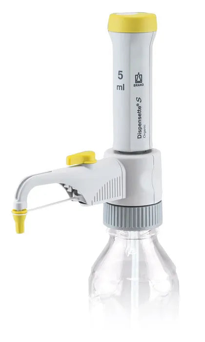 Dispensette® S Organic (yellow color-code): Ideal for dispensing organic solvents, including chlorinated and fluorinated hydrocarbons (e.g., trichlorofluoroethane and dichlormethane), acids like concentrated HCl and HNO3 (except HF), trifluoroacetic acid (TFA), tetrahydrofuran (THF) and peroxides.