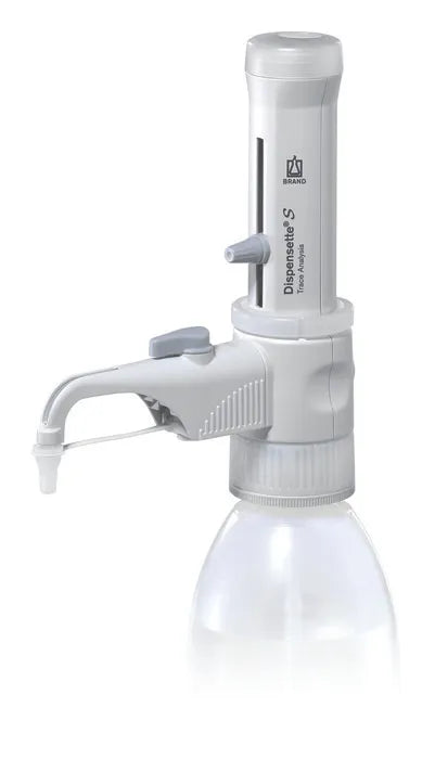 Dispensette® S Trace Analysis Brand bottle-top dispenser, Brand, for threaded bottles GL 45, DE-M marking, performance certificate, telescoping filling tube, recirculation tube (optional), mounting tool and bottle adapters GL 28-S 28 (ETFE), GL 32 (ETFE) and S 40 (PTFE).