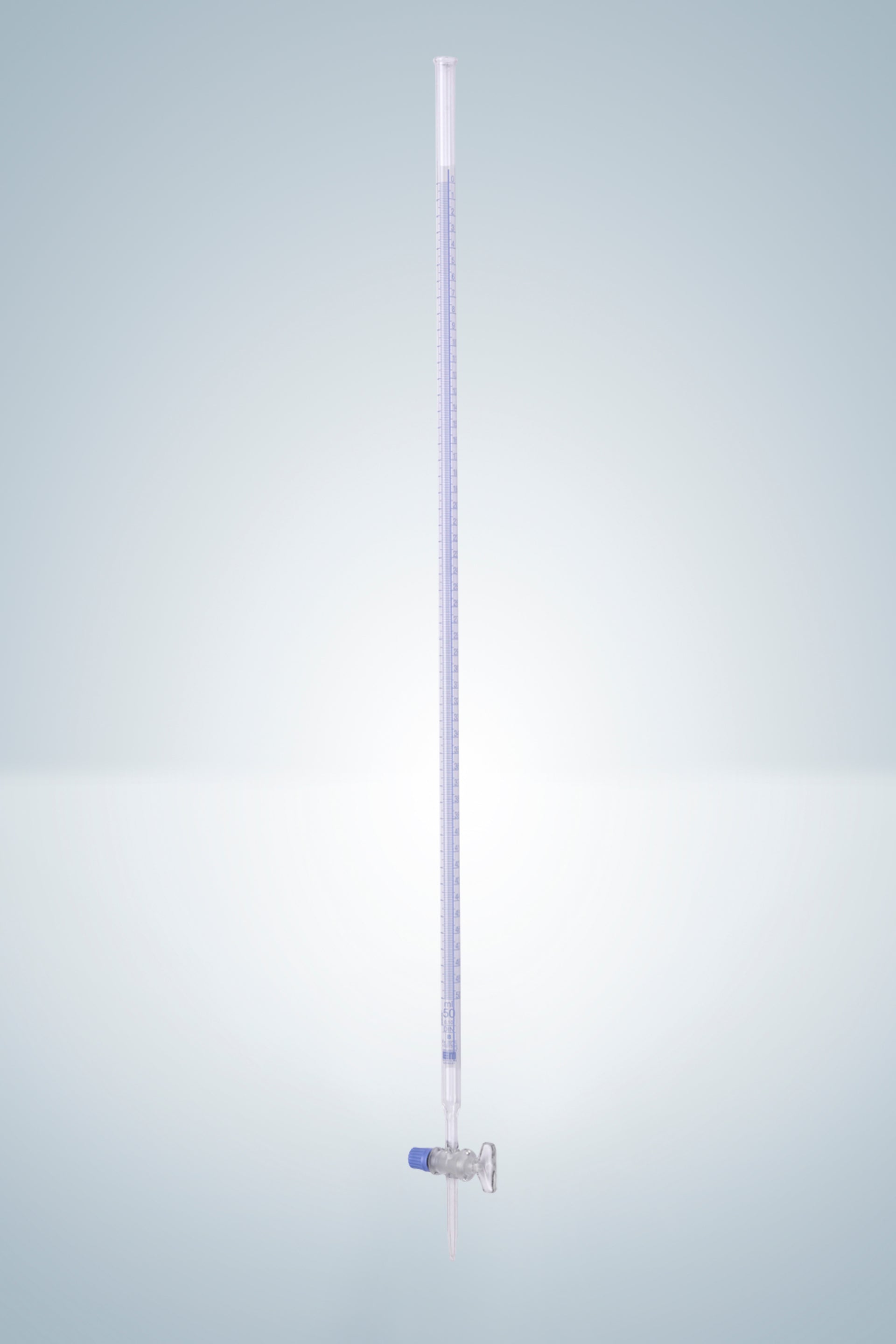 Burettes DURAN®, class B, blue graduation, 10:0,02 ml, Schellbach, short line, straight stopcock with glass key, acc. to DIN EN ISO 385.