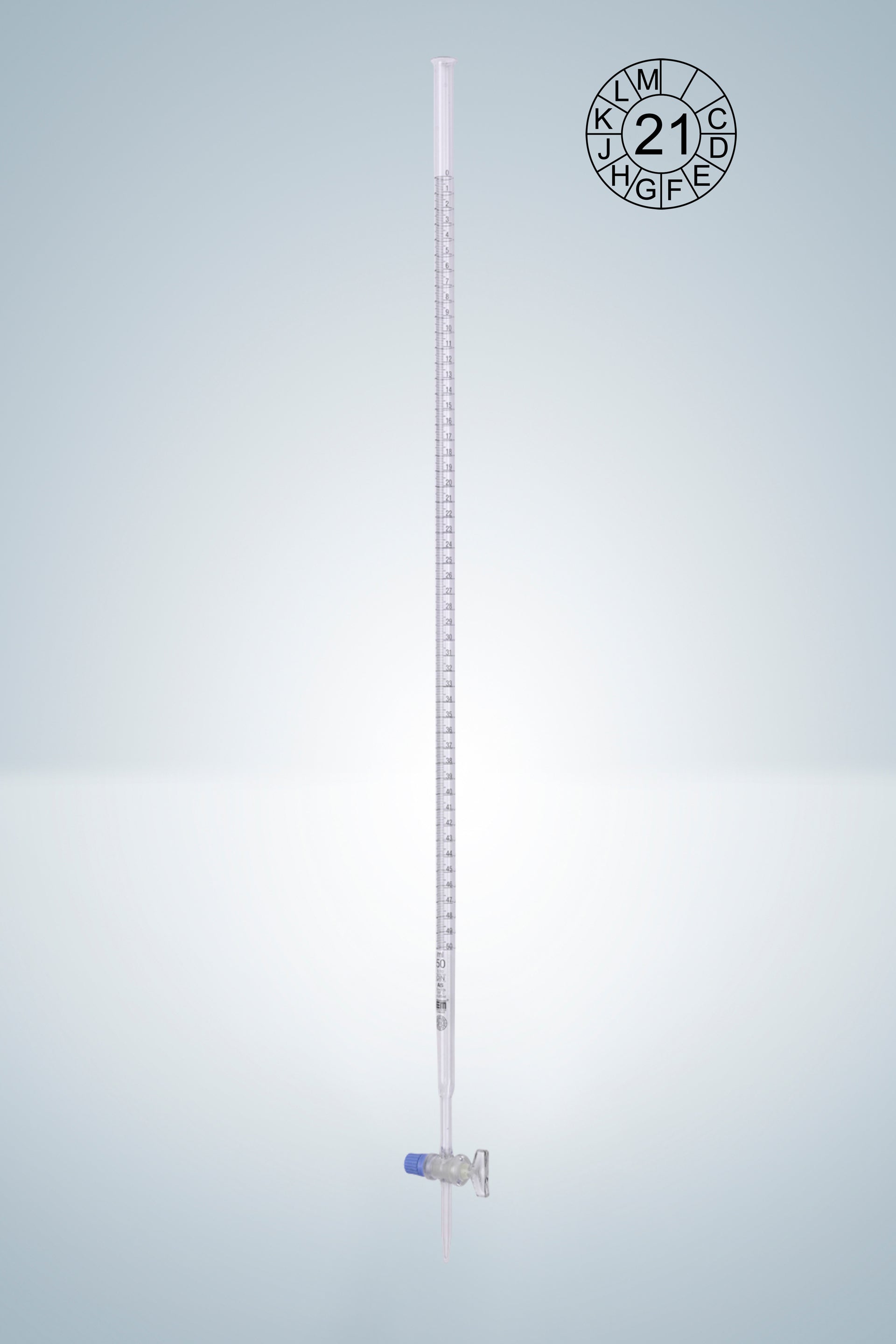 Burettes DURAN®, class AS, black graduation, 50:0,1 ml, clear glass, main point ring graduation, straight stopcock with glass key, acc. to DIN EN ISO 385, with declaration of conformity acc. to DIN 12600, with dated batch identification.