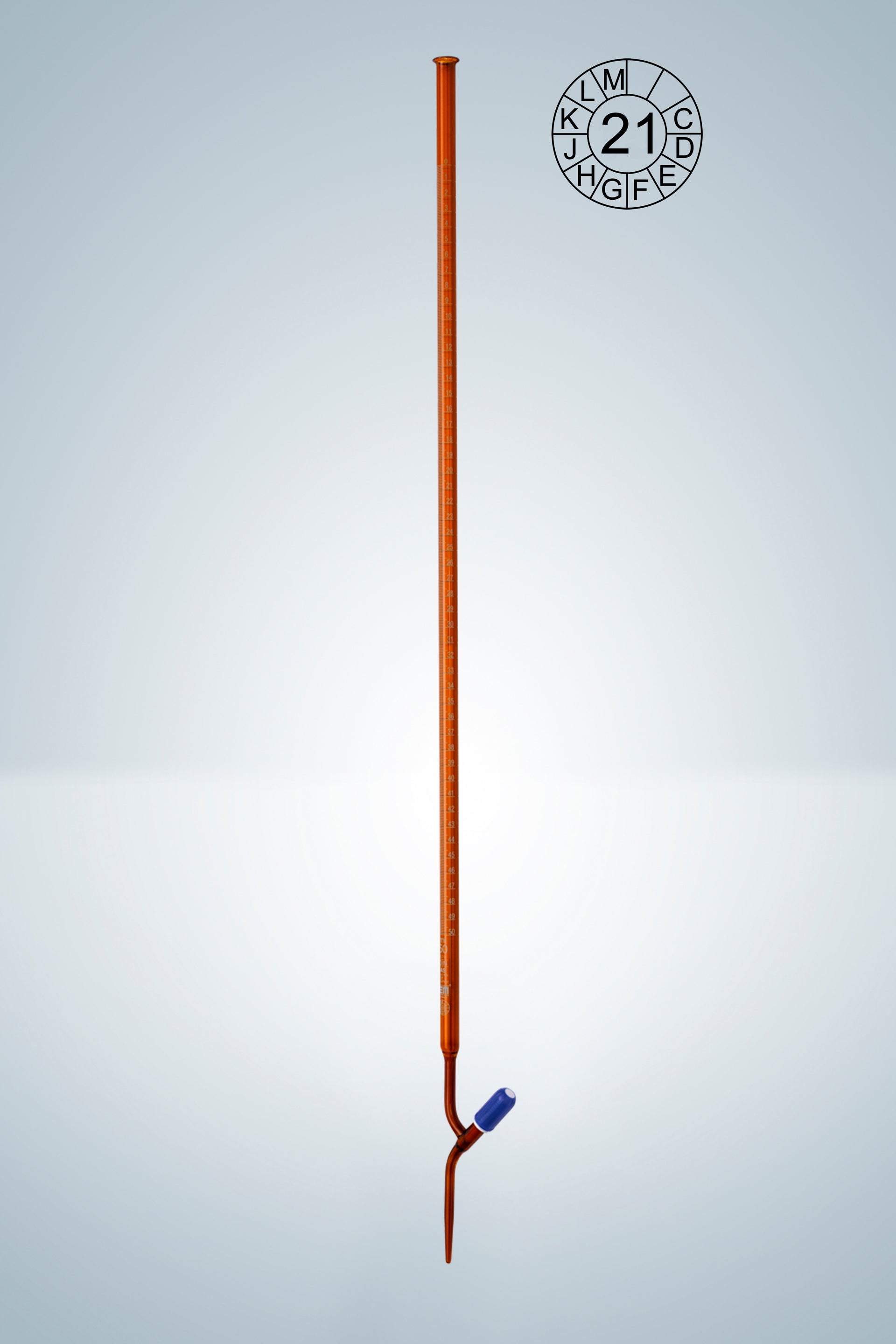 Burettes DURAN®, class AS, white graduation, 50:0,1 ml, amber glass, main point ring graduation, straight valve stopcock with PTFE spindle, acc. to DIN EN ISO 385, with declaration of conformity acc. to DIN 12600, with dated batch identification.