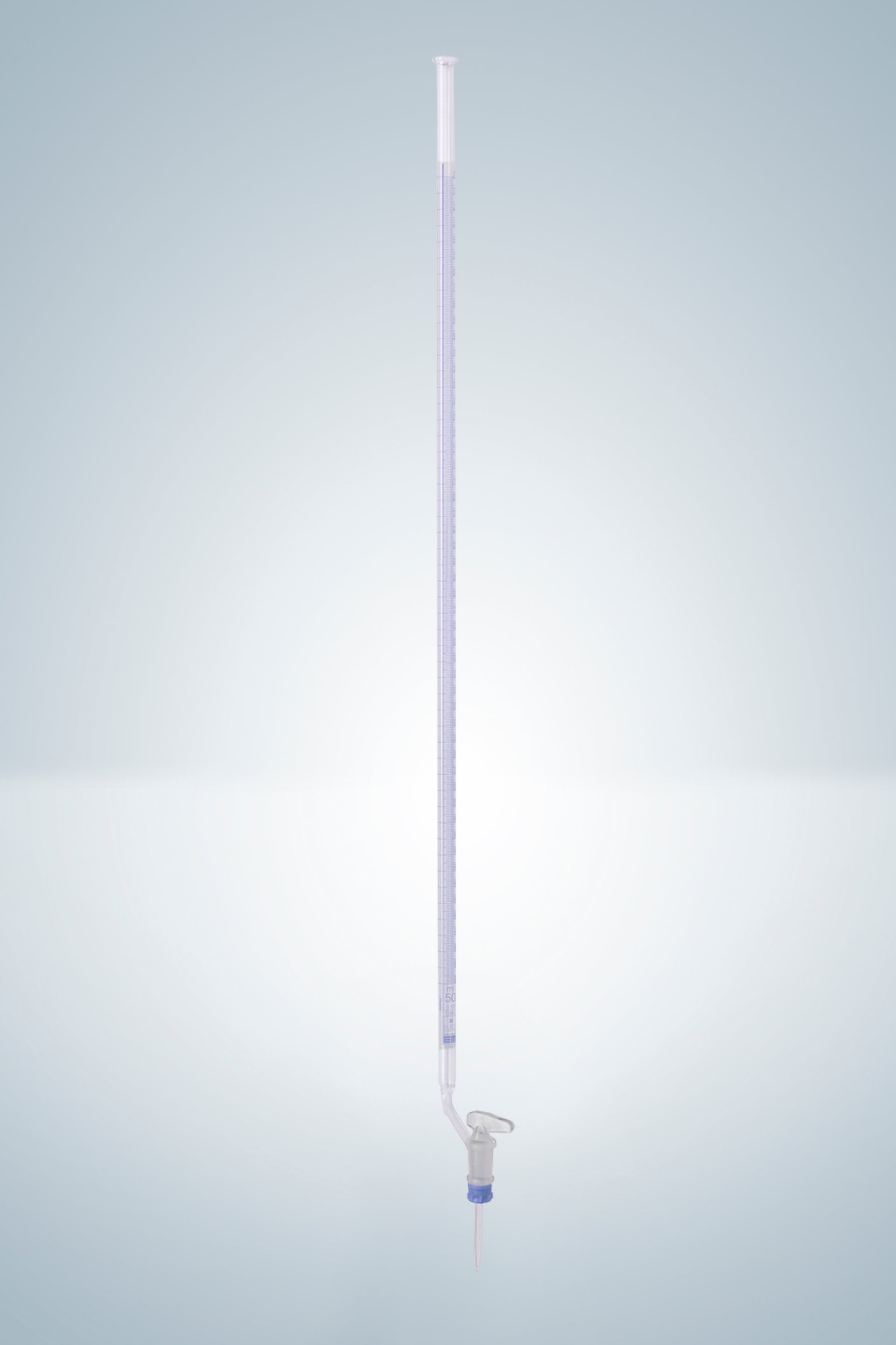 Burettes DURAN®, class B, blue graduation, 50:0,1 ml, Schellbach, short line, lateral stopcock with glass key, acc. to DIN EN ISO 385.