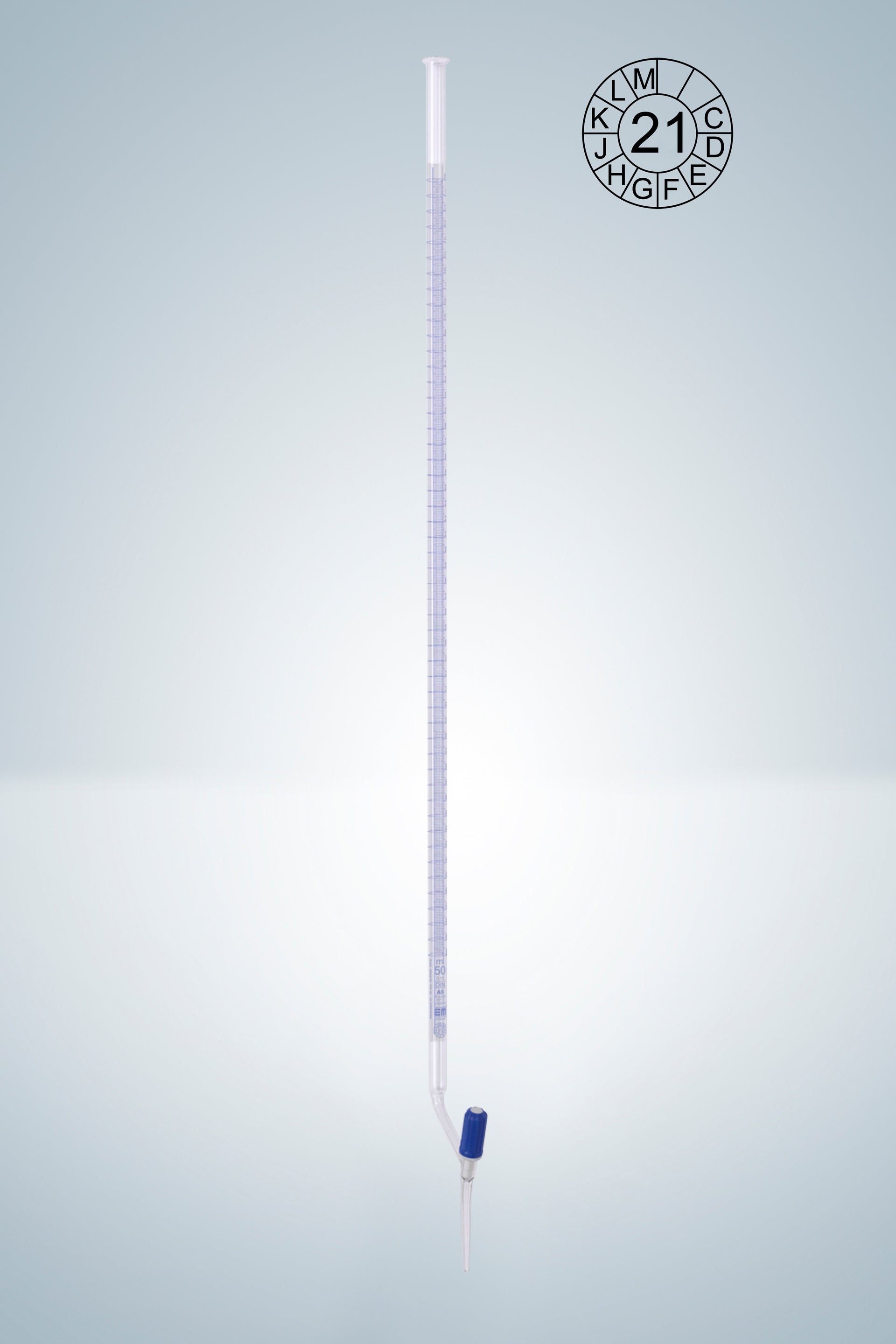 Burettes DURAN®, class AS, blue graduation, 10:0,02 ml, Schellbach, main point ring graduation, lateral stopcock with PTFE spindle, acc. to DIN EN ISO 385, with declaration of conformity acc. to DIN 12600, with dated batch identification.