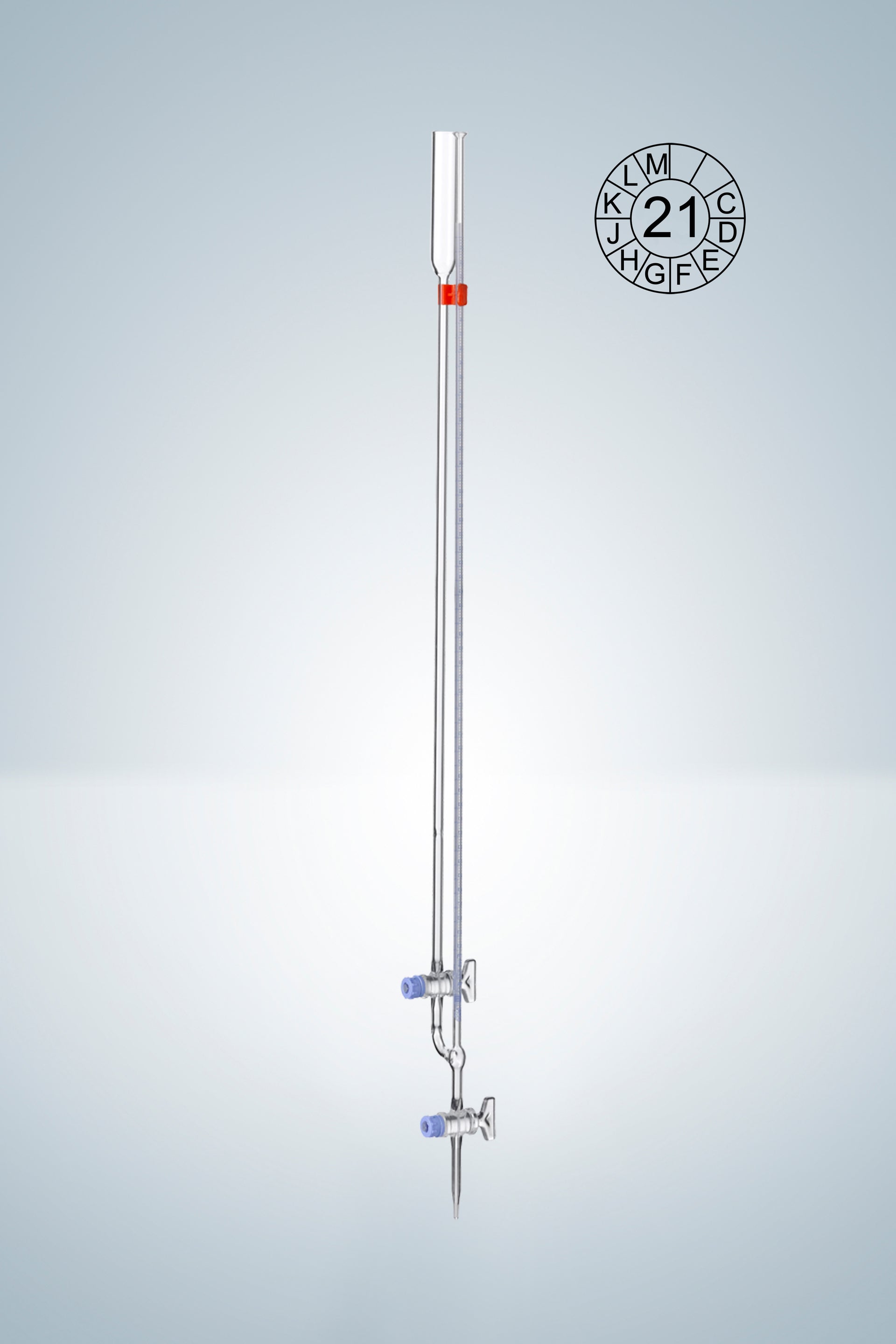Micro burettes DURAN® class AS blue graduation, 10:0,02 ml, Bang pattern, straight stopcock, NS-glass key, Schellbach, with stopcock at the filling tube, main point ring graduation, acc. to DIN EN ISO 385, with declaration of conformity acc. to DIN 12600, with dated batch identification.