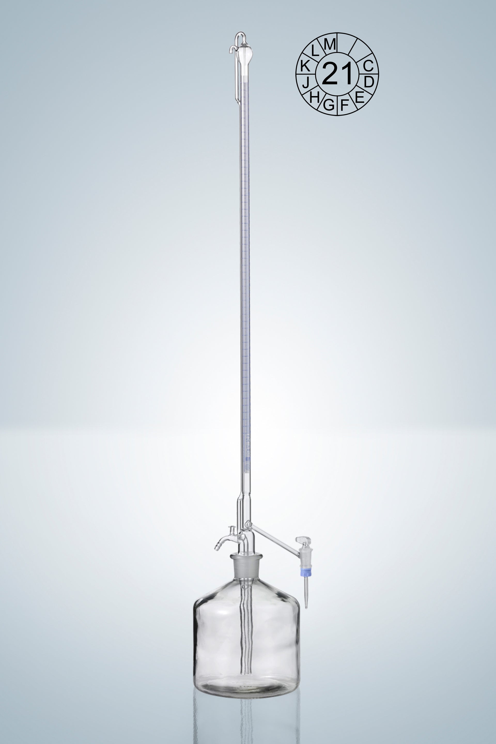Automatic burettes DURAN®, class AS blue graduation, 10:0,02 ml, incl. 2000 ml bottle (clear glass), Pellet, Schellbach, main point ring graduation, lateral glass stopcock, without intermediate stopcock, acc. to DIN EN ISO 385, with declaration of conformity acc. to DIN 12600, with dated batch identification.