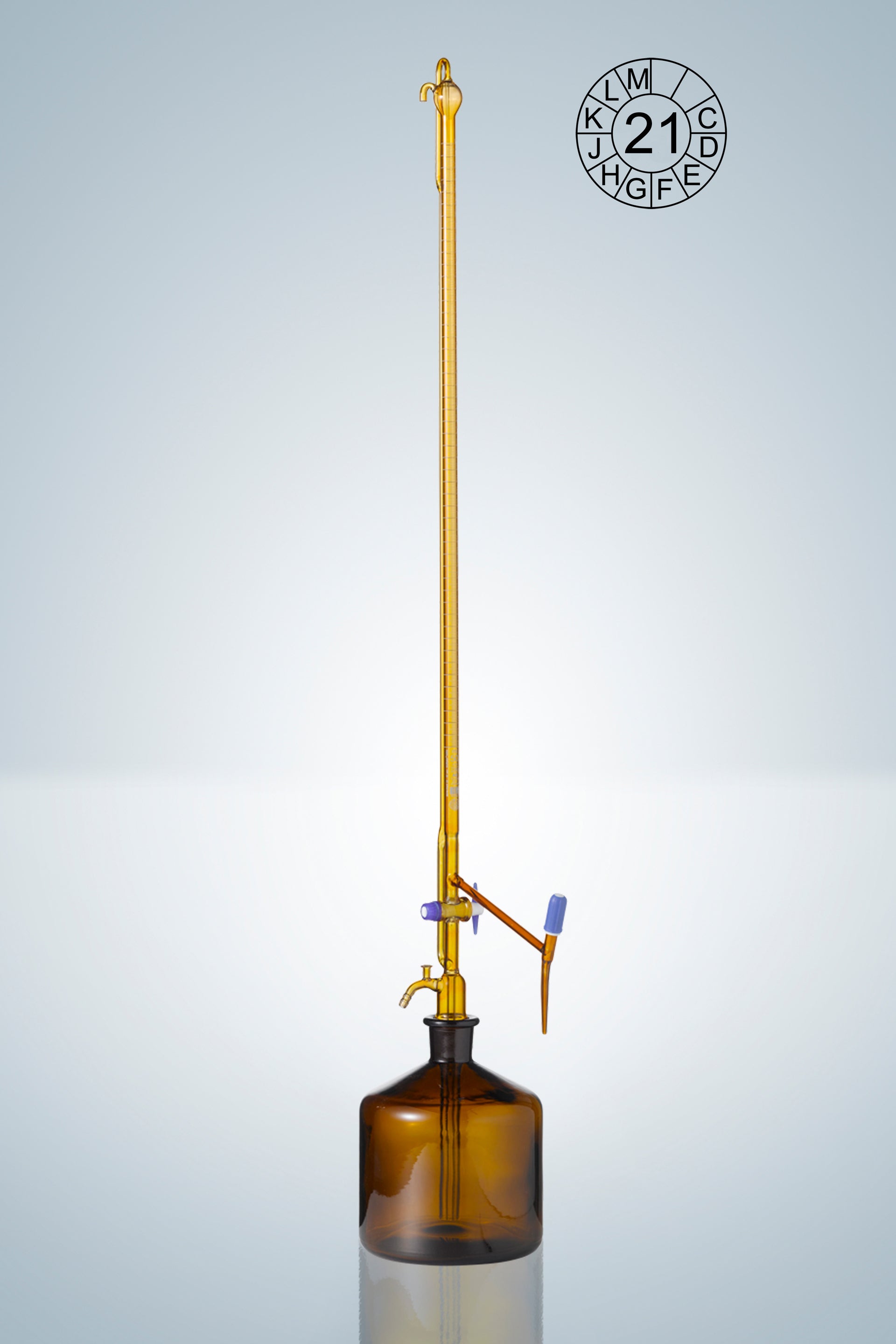 Automatic burettes DURAN®, class AS white graduation, 10:0,02 ml, incl. 2000 ml bottle (amber glass), Pellet, main point ring graduation, with spindle of PTFE and intermediate stopcock, acc. to DIN EN ISO 385, with declaration of conformity acc. to DIN 12600, with dated batch identification.