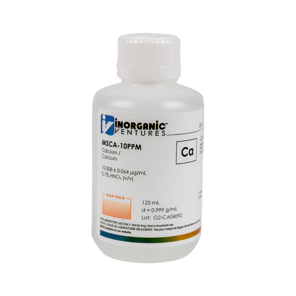 CalciumLocation: Group 2, Period 4 Intended Use: For the calibration of analytical instruments and validation of analytical methods as appropriate.Storage & Handling: Keep tightly sealed when not in use. Store and use at 20 ± 4°C. Do not pipet from container. Do not return portions removed for pipetting to container. Chemical Compatibility: Soluble in HCl and HNO3. Avoid H2SO4 HF, H3PO4 and neutral to basic media. Stable with most metals and inorganic anions forming insoluble silicate, carbonate, hydroxide, oxide, fluoride, sulfate, oxalate, chromate, arsenate, and tungstate in neutral aqueous media. Stability: 2-100 ppb levels stable for months in 1% HNO3 / LDPE container. 1-10,000 ppm solutions chemically stable for years in 1-10% HNO3 / LDPE container. Ca Containing Samples (Preparation & Solution): Metal (best dissolved in diluted HNO3); Ores (carbonate fusion in Pt0 followed by HCl dissolution); Organic Matrices (dry ash and dissolution in dilute HCl. Do not heat when dissolving to avoid precipitation of SiO2). The oxide, hydroxide, carbonate, phosphate, and fluoride of calcium are soluble in % levels of HCl or HNO3. The sulfates (gypsum, anhydrite, etc.), certain silicates, and complex compounds require fusion with Na2CO3 followed by HCl / water dissolution. Note that contamination is a very real problem when analyzing for trace levels. |