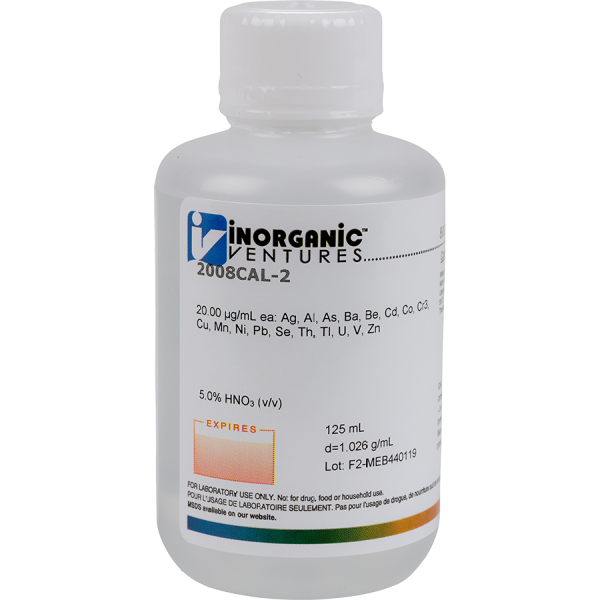 These calibration standards have been specifically prepared to meet the requirement of EPA method 200.8. The solutions group compatible elements taking into consideration the order of addition. They have also been tested for stability over a number of years and have a 4 year shelf life in the proprietary TCT bags offered by Inorganic Ventures.