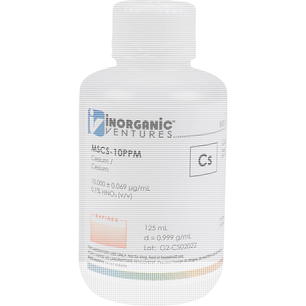 CesiumLocation: Group 1, Period 6 Intended Use: For the calibration of analytical instruments and validation of analytical methods as appropriate.Storage & Handling: Keep tightly sealed when not in use. Store and use at 20 ± 4°C. Do not pipet from container. Do not return portions removed for pipetting to container. Chemical Compatibility: Soluble in dilute HCl, HNO3, H2SO4 and HF aqueous matrices. Stable with most metals and inorganic anions. Forms insoluble Cs2[PtCl6]. Stability: 2-100 ppb levels stable for months in 1% HNO3 / LDPE container. 1-10,000 ppm solutions chemically stable for years in 0.1% HNO3 / LDPE container. Will crystallize out of higher (~ 5%) levels of HNO3 at > 1000 µg/mL. Cs Containing Samples (Preparation & Solution): Metal (dissolves very rapidly in water); Ores (sodium carbonate fusion in Pt0 followed by HCl dissolution - blank levels of Cs in sodium carbonate critical); Organic Matrices (Sulphuric / peroxide digestion or nitric / Sulphuric / perchloric acid decomposition). |