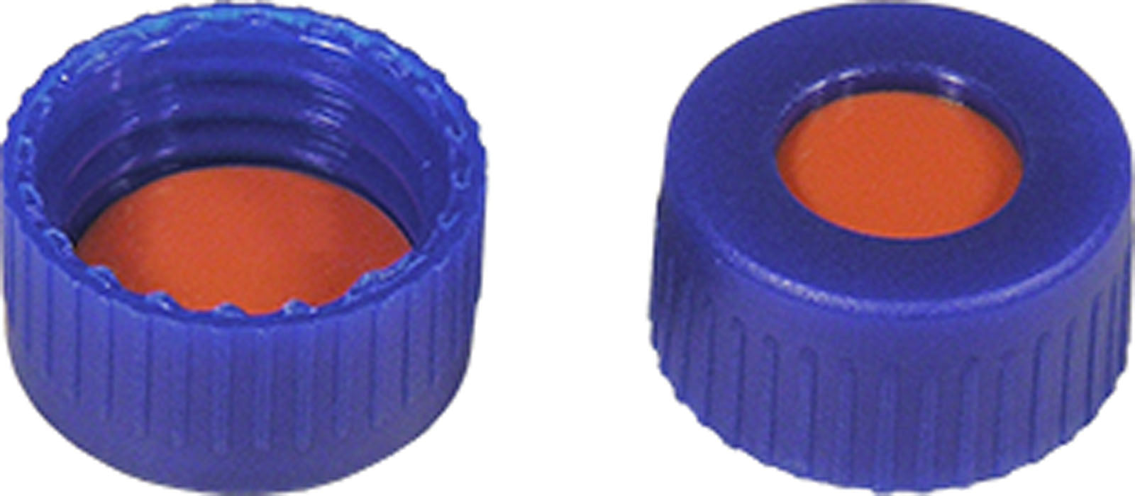 Bonded screw closures N 9 with Red Rubber / TEF colorless liners. Septa firmly connected with cap and cannot be removed.
