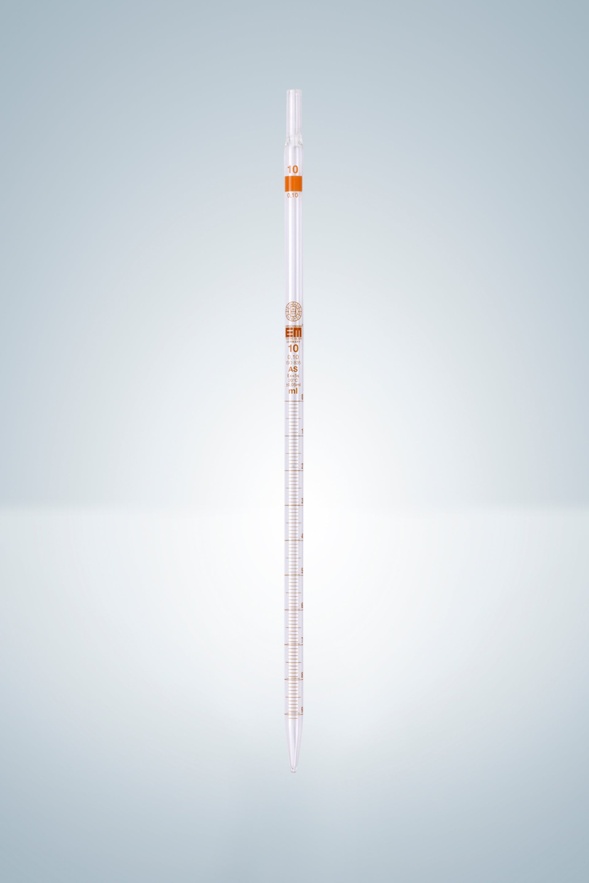 Graduated pipettes, class B, amber stain graduation, 25:0,1 ml. AR-glass®. EX (TD) calibrated. Tolerances better than class B requirements. With durable amber stain graduation, short line, graduated to tip, zero on top, type 3, acc. to DIN 835. From 5 ml with cotton plug end as standard.