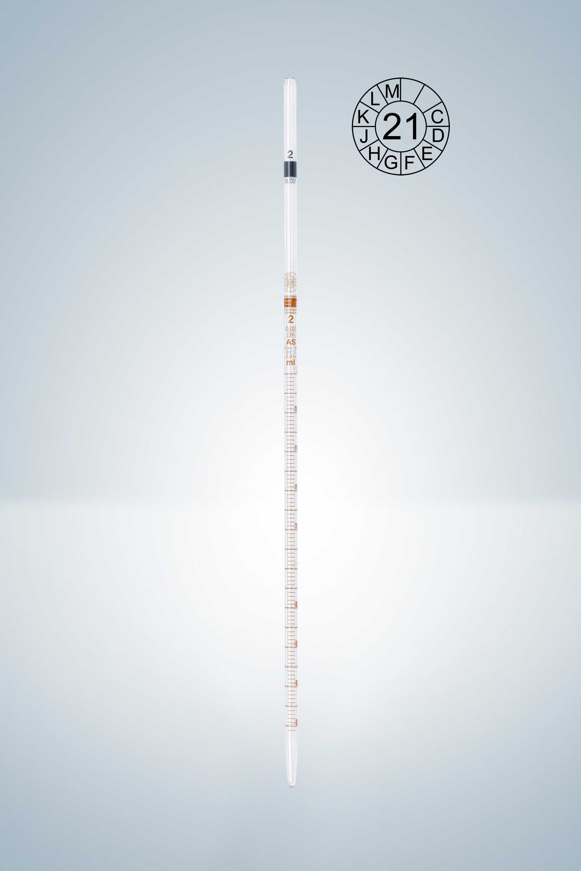 Graduated pipettes, class AS, amber stain graduation, 5:0,1 ml, AR-glass, main point ring graduation, type 2, zero in tip, graduated to the tip, EX (TD) calibrated, acc. to DIN EN ISO 835, from 5 ml on with a cotton plug end as standard, for additional quality certificates, with declaration of conformity acc. to DIN 12600, with dated batch identification.