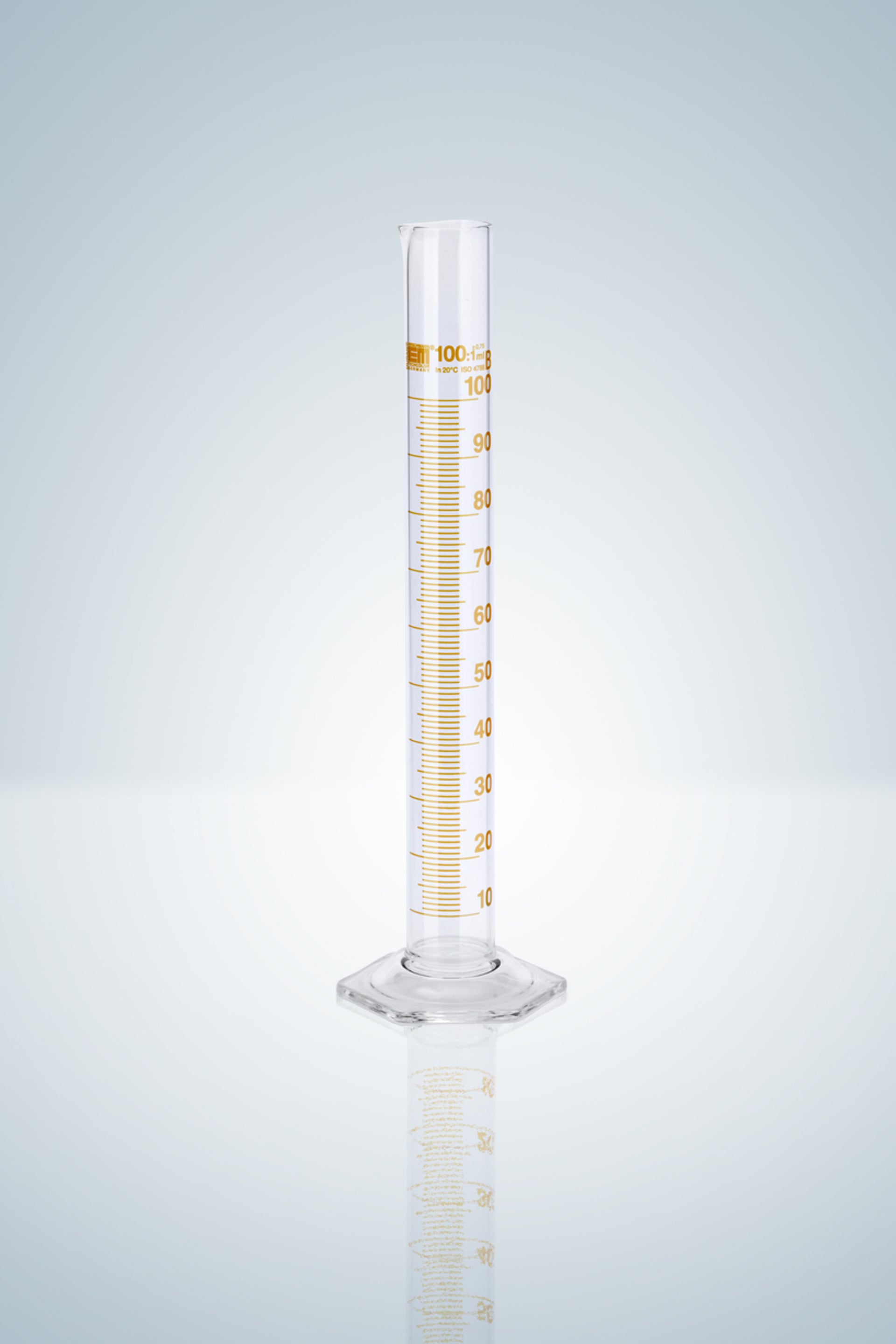 Measuring cylinder DURAN®, class B, amber graduation, 10:0,2 ml, H 140 mm, with spout, short line, acc. to DIN EN ISO 4788.
