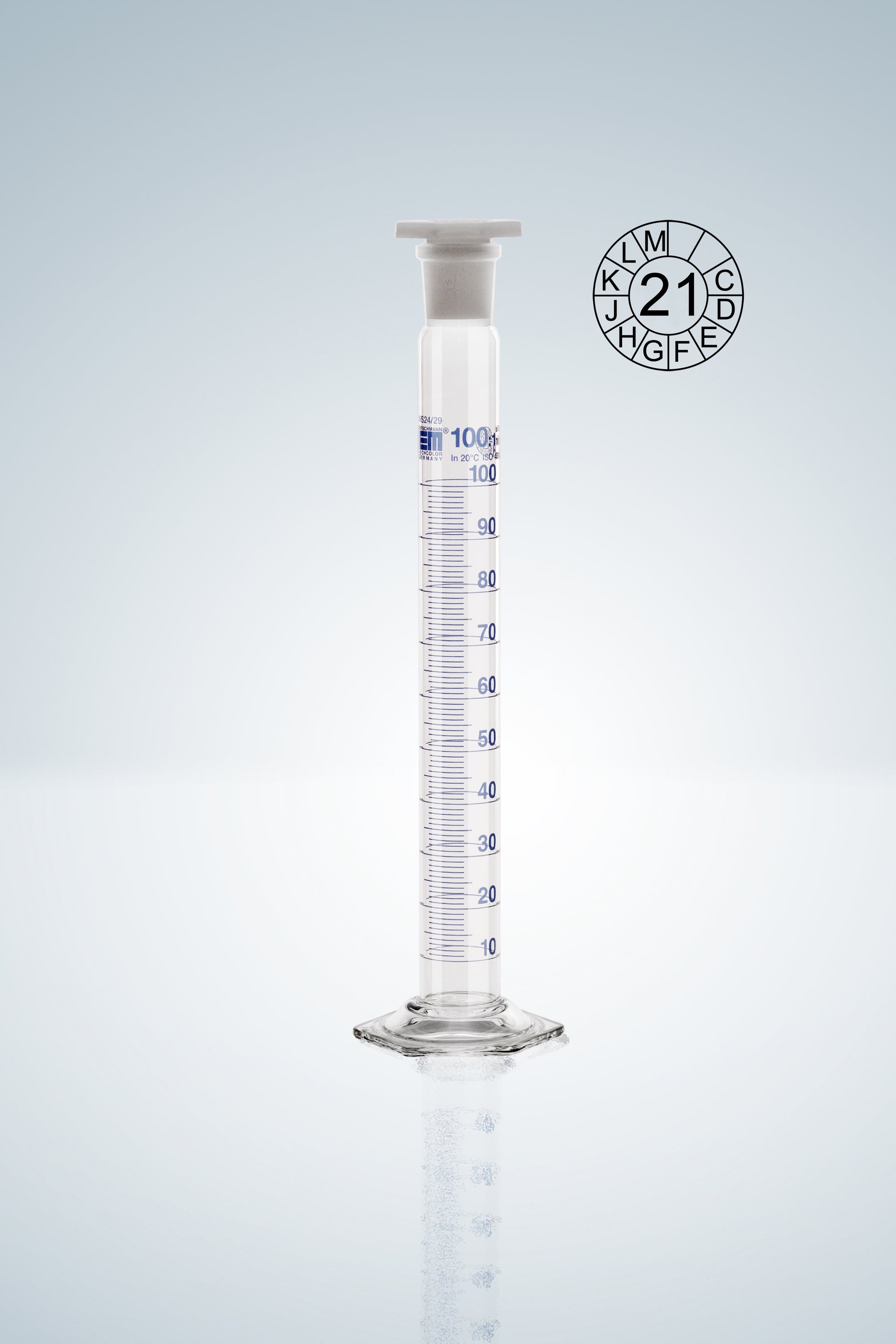 Measuring cylinder DURAN®, class A, blue graduation, 100:1 ml, NS 24/29, H 290 mm, with NS ground and Polyethylene stopper, main point graduation, with declaration of conformity acc. to DIN 12600, with dated batch identification, acc. to DIN EN ISO 4788.