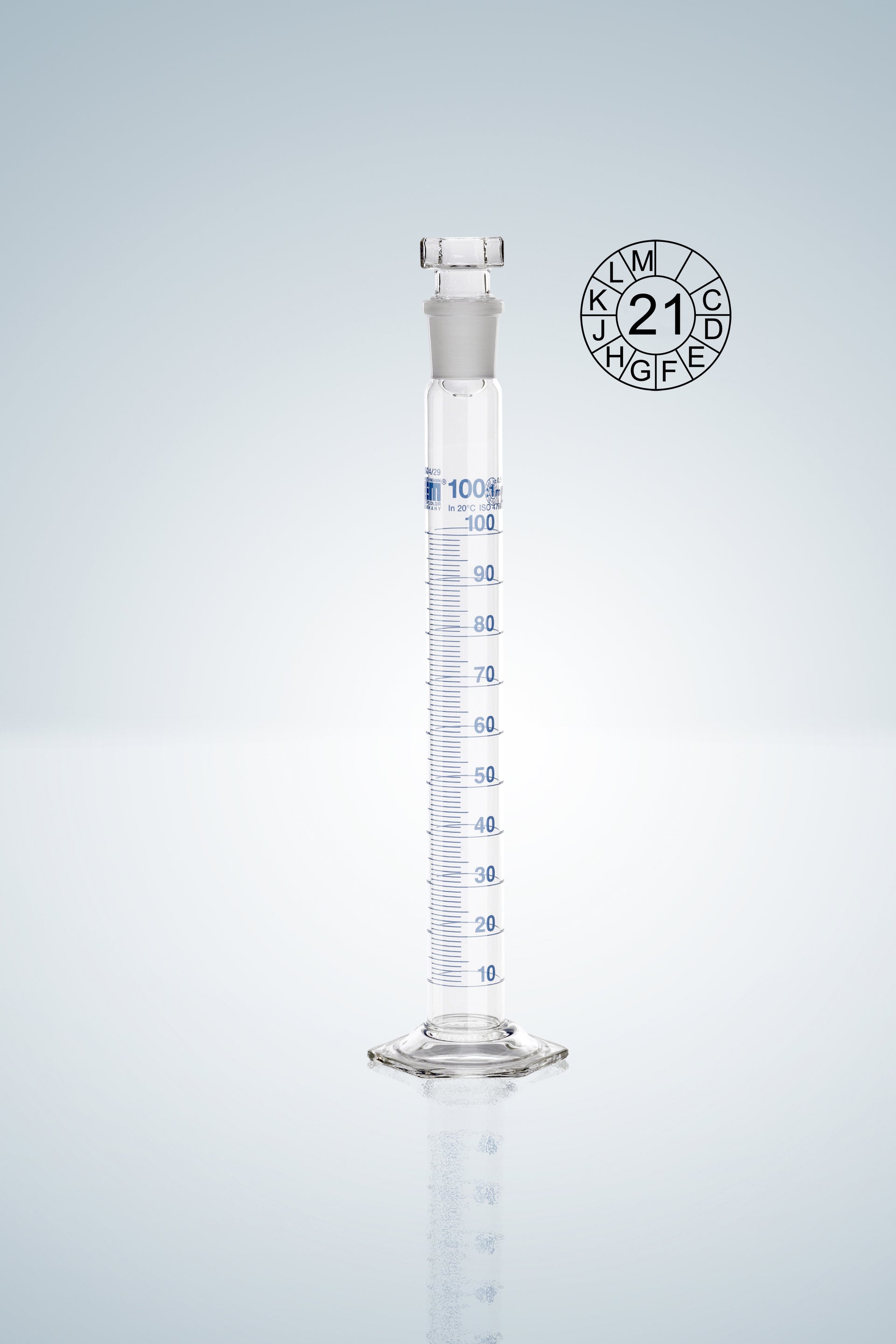 Measuring cylinder DURAN®, classA, blue graduation, 100:1 ml, NS 24/29, H 290 mm, with NS ground and hollow glass stopper, main point graduation, with declaration of conformity acc. to DIN 12600, with dated batch identification, acc. to DIN EN ISO 4788.