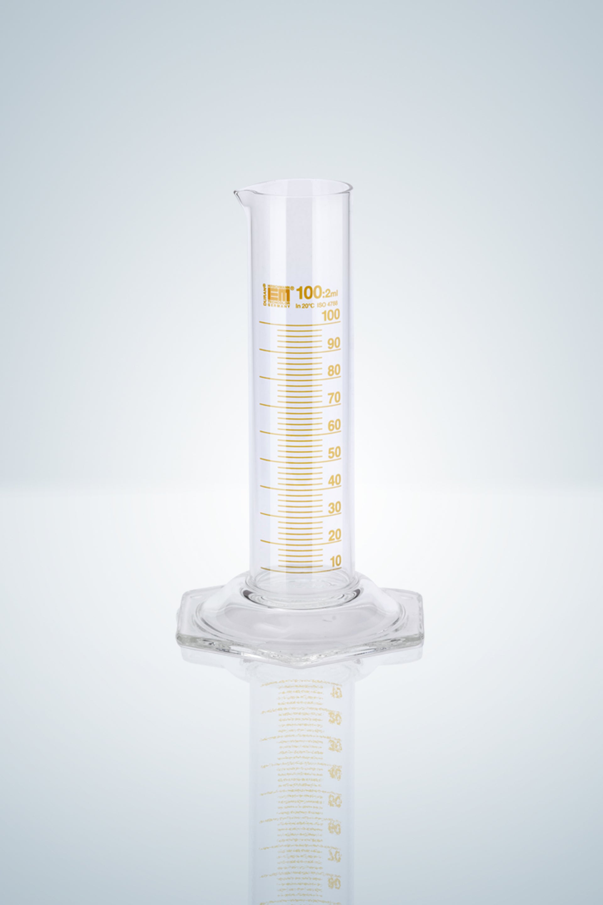 Measuring cylinder DURAN®, class B, amber graduation, low form, 10:1 ml, short line, acc. to DIN EN ISO 4788.