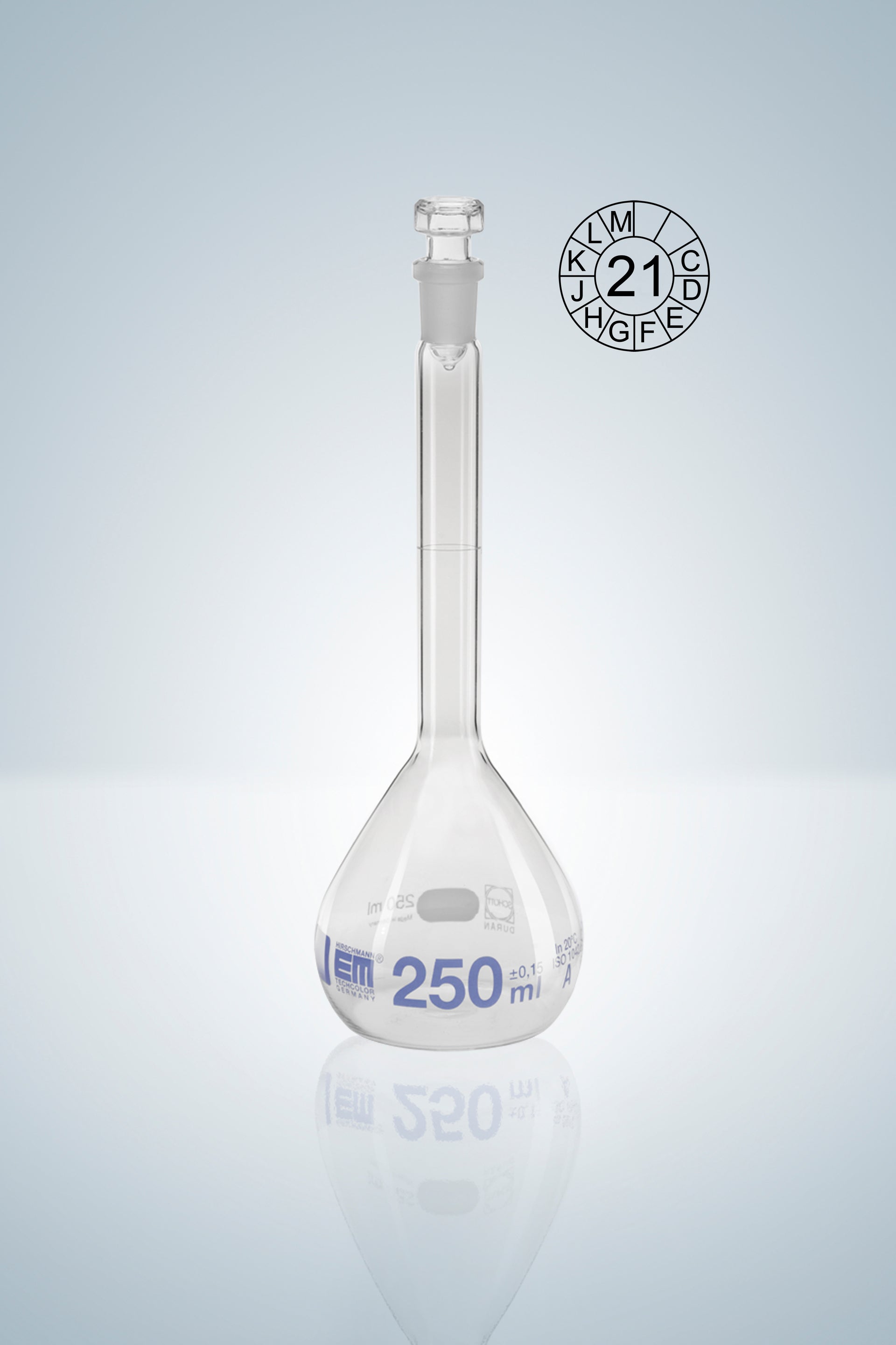 Volumetric flasks DURAN®, class A, blue graduation, 20:0,06 ml, NS 12/21, H 105 mm, with NS ground and hollow glass stopper, with declaration of conformity acc. to DIN 12600, with dated batch identification, acc. to DIN EN ISO 1042.
