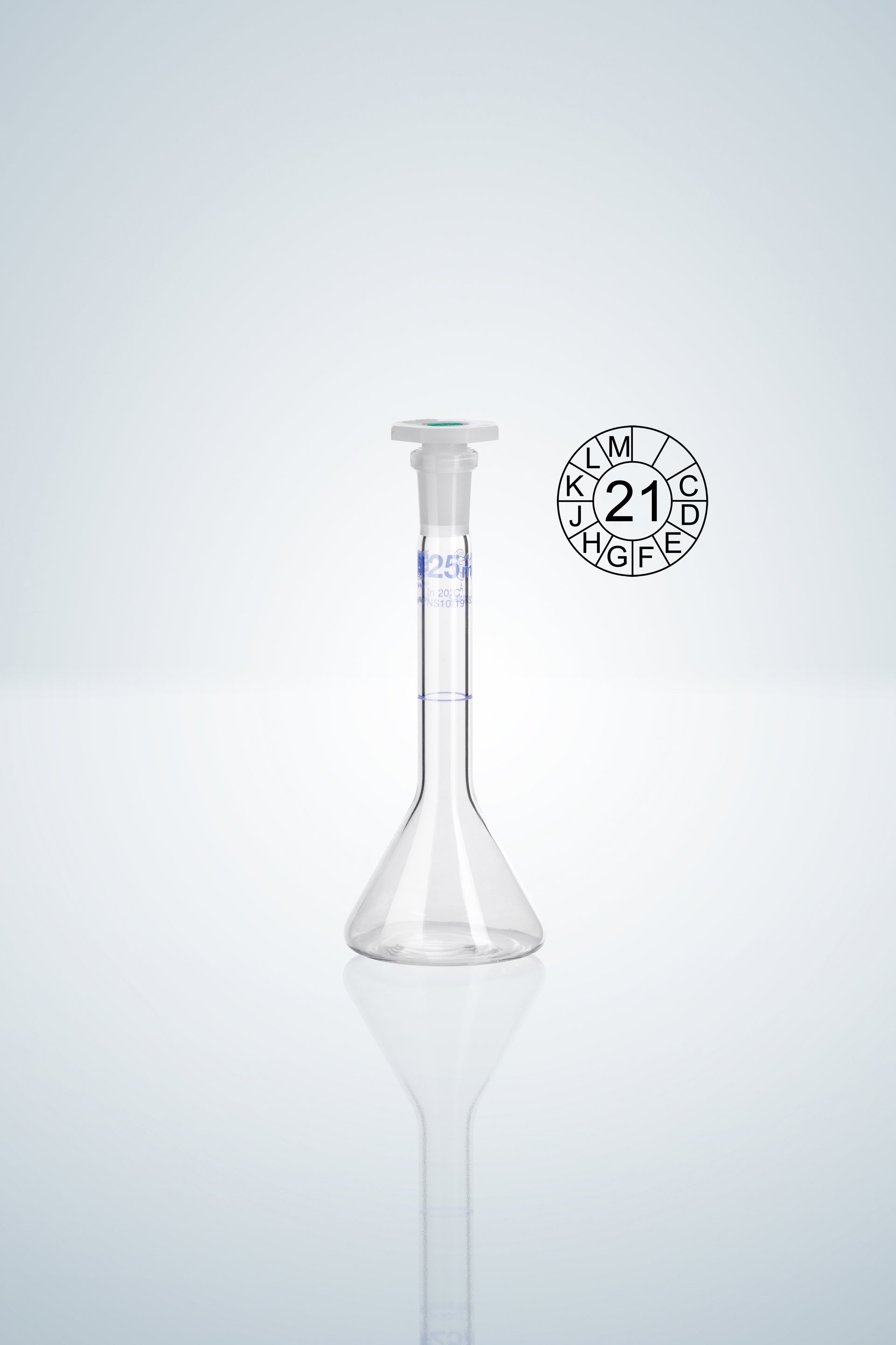 Volumetric flasks DURAN®, class A, blue graduation, 50:0,06 ml, NS 12/21, H 140 mm, conical form, NS ground and Polyethylene stopper, with declaration of conformity acc. to DIN 12600, with dated batch identification, acc. to DIN EN ISO 1042.